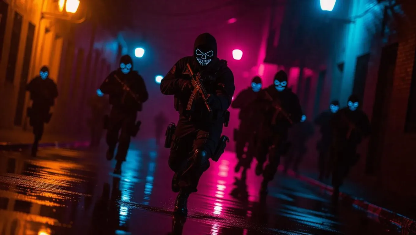 Create intense AI-generated scenes of masked robbers in tactical gear sprinting through neon-lit alleyways. Capture gritty GTA-inspired visuals with cinematic low-angle shots, eerie masks, glistening wet pavement, and shallow depth of field for dramatic, stylized action imagery. Perfect for dynamic, menacing urban storytelling.