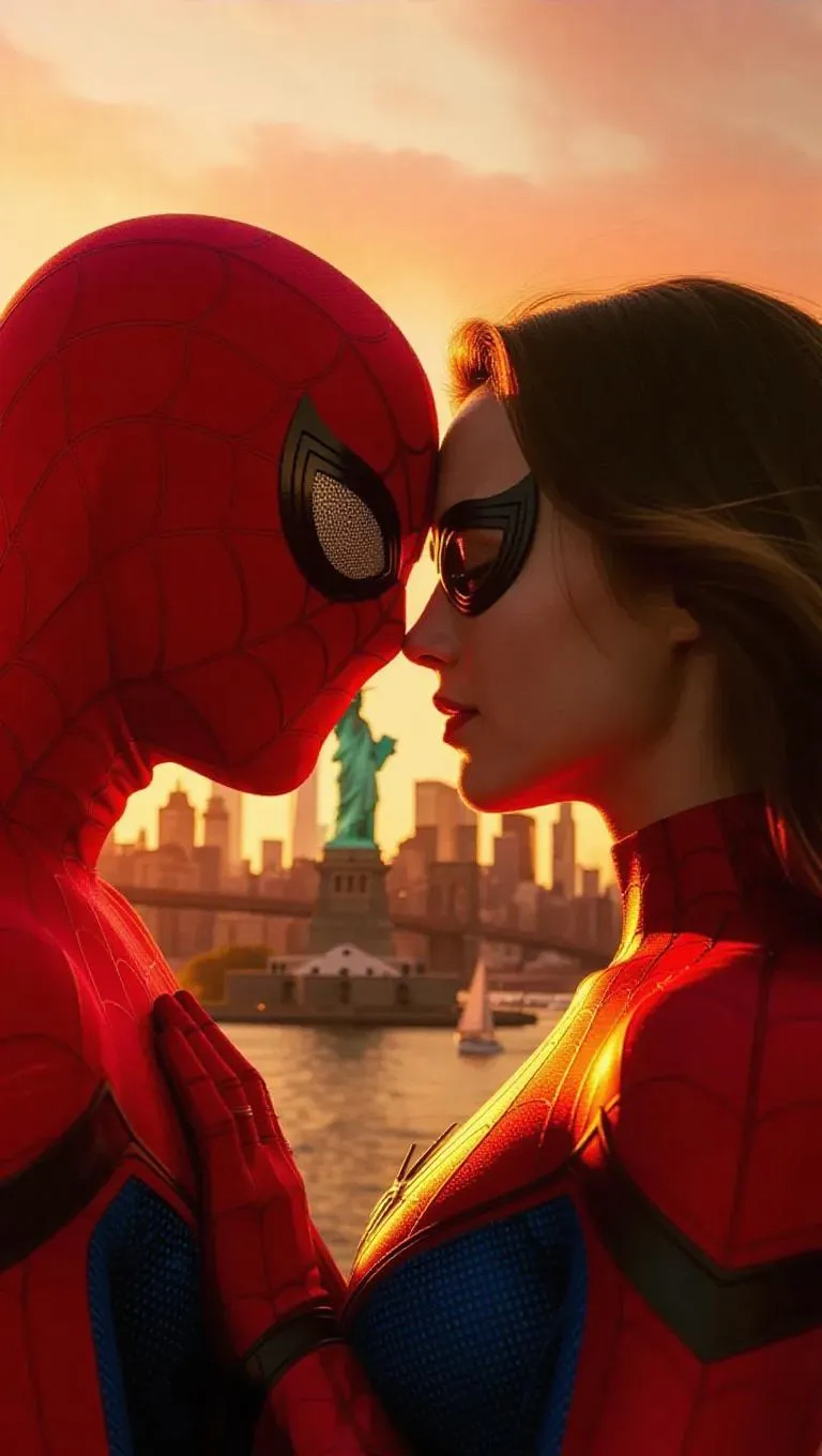Spiderman and Spiderwoman entwined in a passionate embrace, their masks partially removed, revealing tender expressions. Set against a vibrant New York City skyline at sunset, with the Statue of Liberty and the Brooklyn Bridge adding iconic flair. Warm, golden light bathes the scene, enhancing the romantic atmosphere.