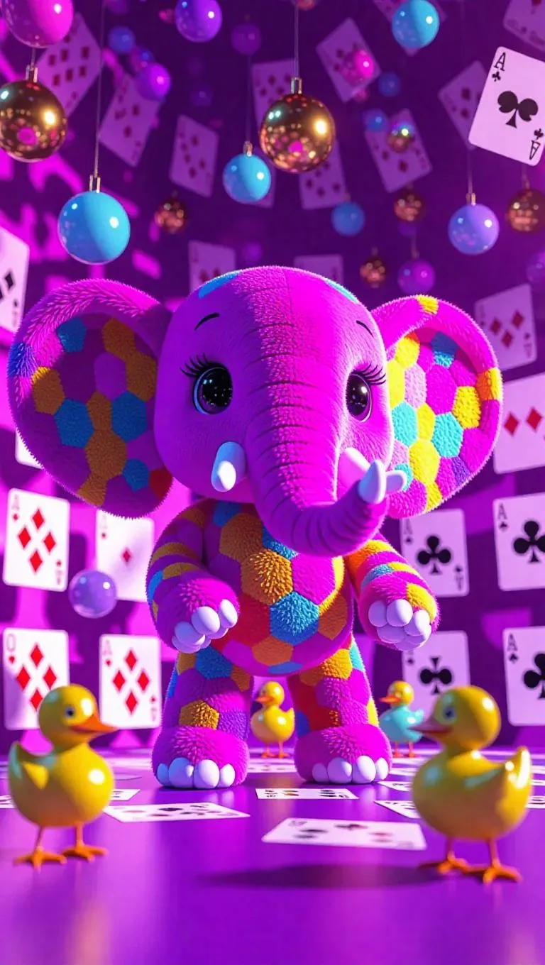 Create a surreal AI-generated scene of a fantasy toy factory with a plush elephant spraying colorful bubbles, dancing stilted ducks, playing card walls, and spinning top chandeliers. Soft light purple hues, reduced saturation, and Octane rendering enhance the dreamlike atmosphere. Optimized with anti-aliasing, reflection blur, and noise control for crisp, professional-quality visuals.