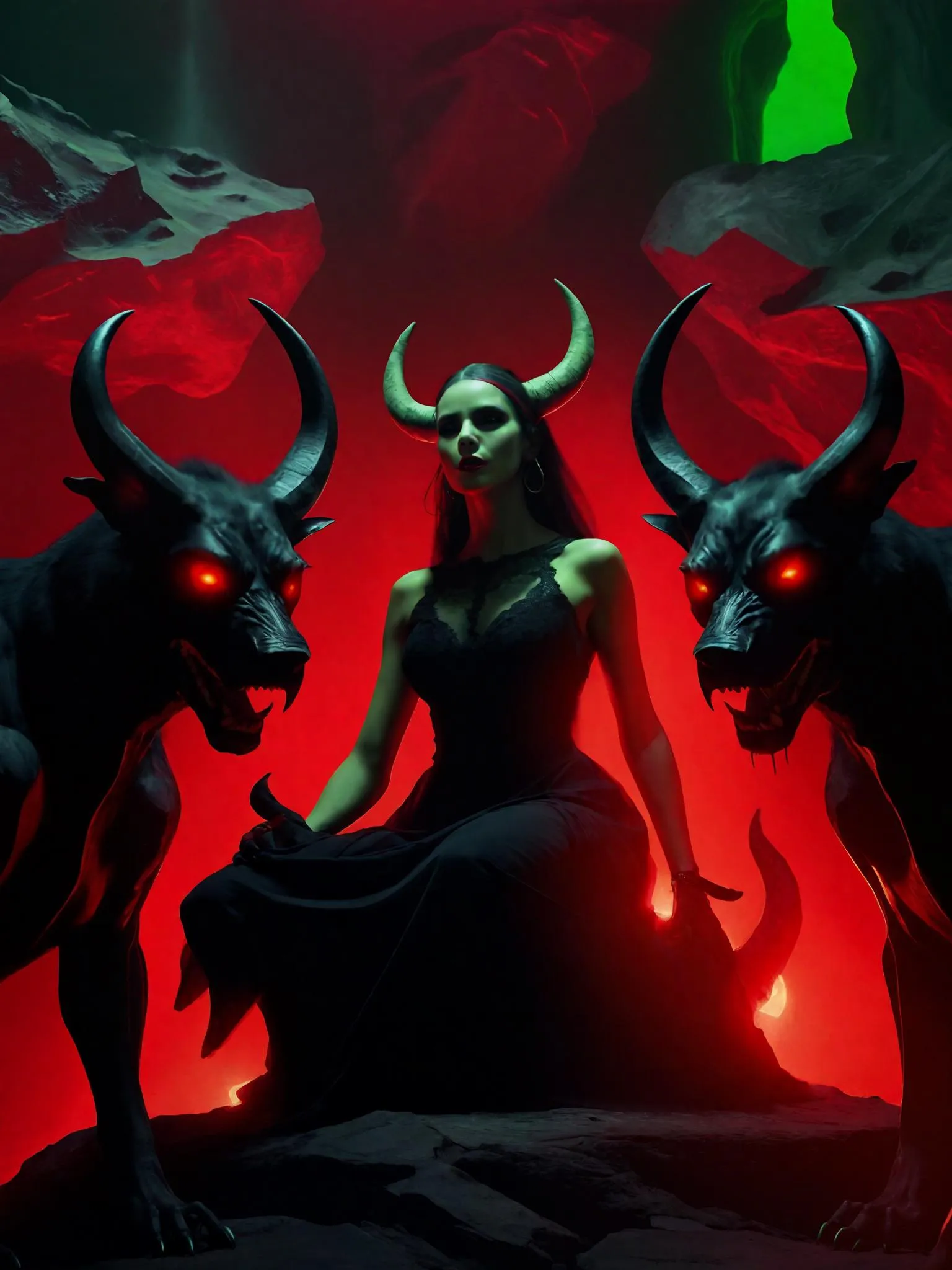 Generate AI art of a slender female demon with curved horns in a black dress. Sitting centrally, she gestures welcomingly while flanked by two black demon dogs (hellhounds) with glowing red eyes. Set in an ultra-realistic 4K underground cavern with stalagmites, strange glows, and enhanced darkness. Create slimy, nightmare-style visuals. Bring your dark fantasy to life.