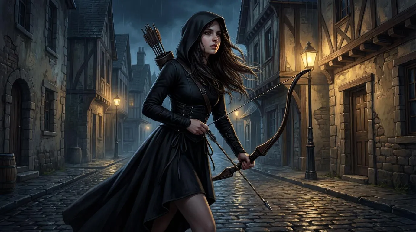 The long haired girl dressed with black hoodie dress as a thief in medieval Victorian city holding bow and arrow