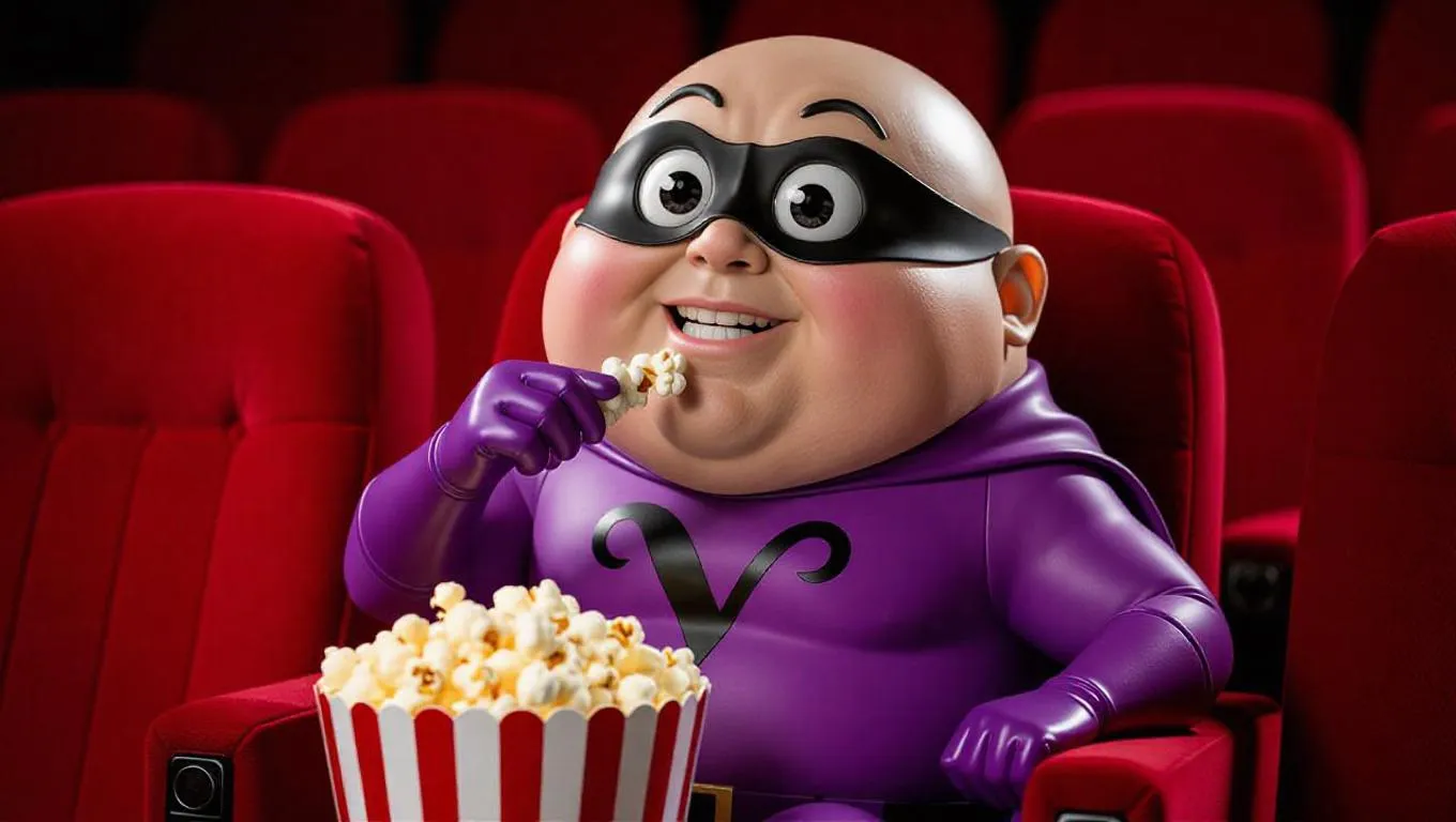Generate a quirky, hyper-realistic AI superhero character with vibrant details—chubby figure, bold violet costume, playful "V" emblem, cinematic popcorn scene. Perfect for creative AI art, animation concepts, and eye-catching visual storytelling using vivago.ai's advanced image generation tools.