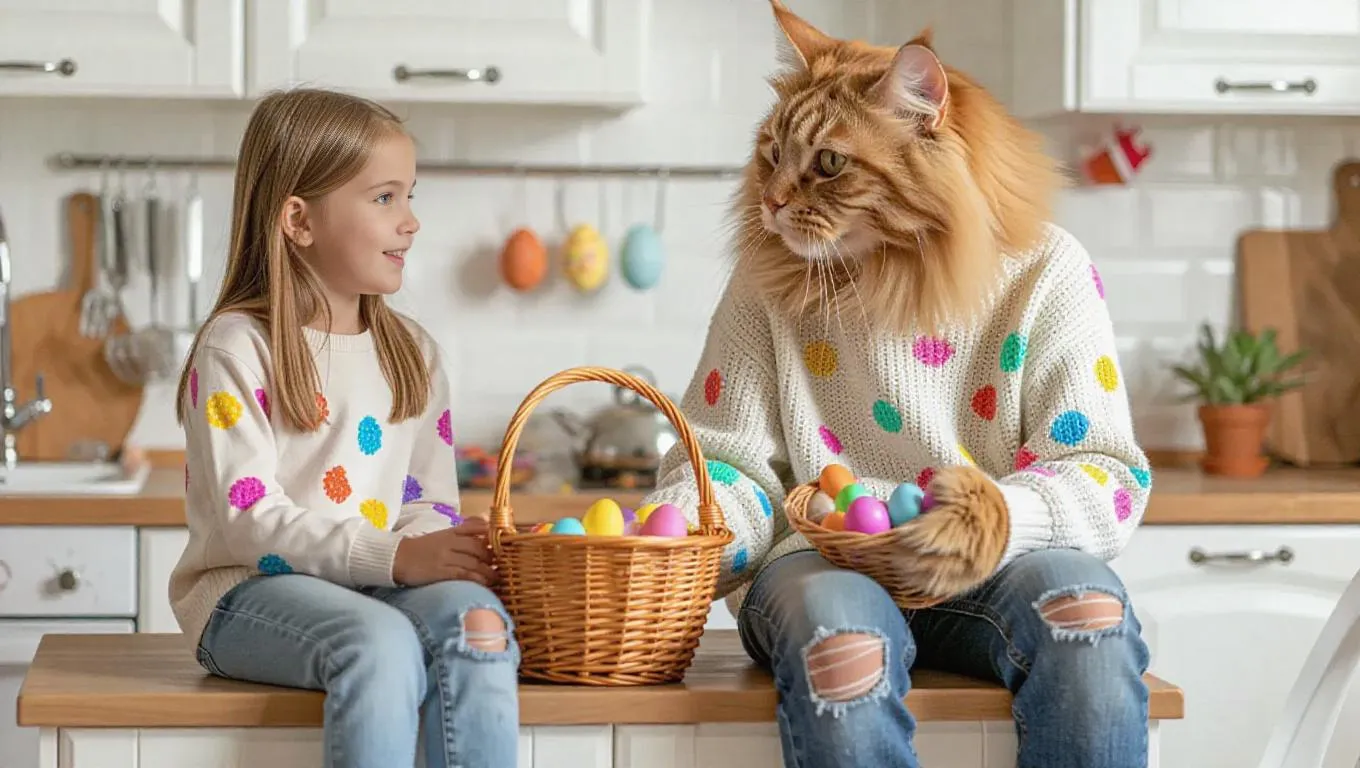 This is a moment of joyful communication between a LIGHT-HAIRED girl and a humanoid cat with a large light-red fluffy head and the body of an adult man in the process of preparing for Easter. The girl is casually sitting on the nightstand, and the CAT is collecting an Easter basket - they are in the kitchen. Their looks are full of friendliness and fun, they are clearly absorbed in the conversation. The CAT is wearing a light sweater with multi-colored paint spots, which indicates his active participation in coloring eggs. His jeans are also stained with paint and have scuffs on the knees. On his feet, he is wearing light sneakers with red stripes. His pose is dynamic, he is slightly leaning towards the girl, as if he is telling her something. The girl is wearing a gray elongated sweater and light blue ripped jeans with patches on the knees. On her feet, she is wearing red sneakers with white polka dots with a white sole and laces. She is sitting on the kitchen countertop, her legs dangling down and facing the CAT. Her pose is relaxed and casual. The surrounding space is a cozy kitchen with white cabinets, a wooden countertop and various kitchen utensils in the background - a stove, oven, kettle, dishes and other utensils are visible. On the countertop, next to the girl, there are painted Easter eggs of different colors. Easter eggs, paints, brushes, paper and other craft supplies are also scattered on the floor, which creates a sense of creative chaos and preparation for the holiday. Finished, brightly painted eggs are visible in baskets.