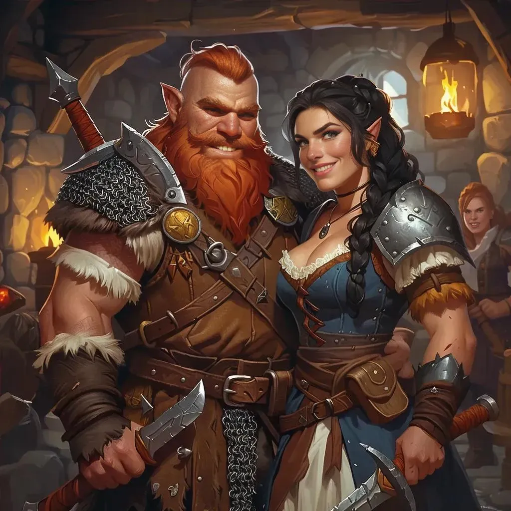Vivid ink painting of a rugged Mountain Dwarf Mercenary and towering Orc wife protectively back-to-back in a mystical steampunk tavern brawl. He wields dual daggers and magical axes; she grips a rune-etched hammer. Dramatic shadows, torches, stone walls, and drunk lizardfolk enhance this mystic fantasy scene. Realistic details blend with futuristic steampunk elements for a dynamic, action-packed long-shot composition.