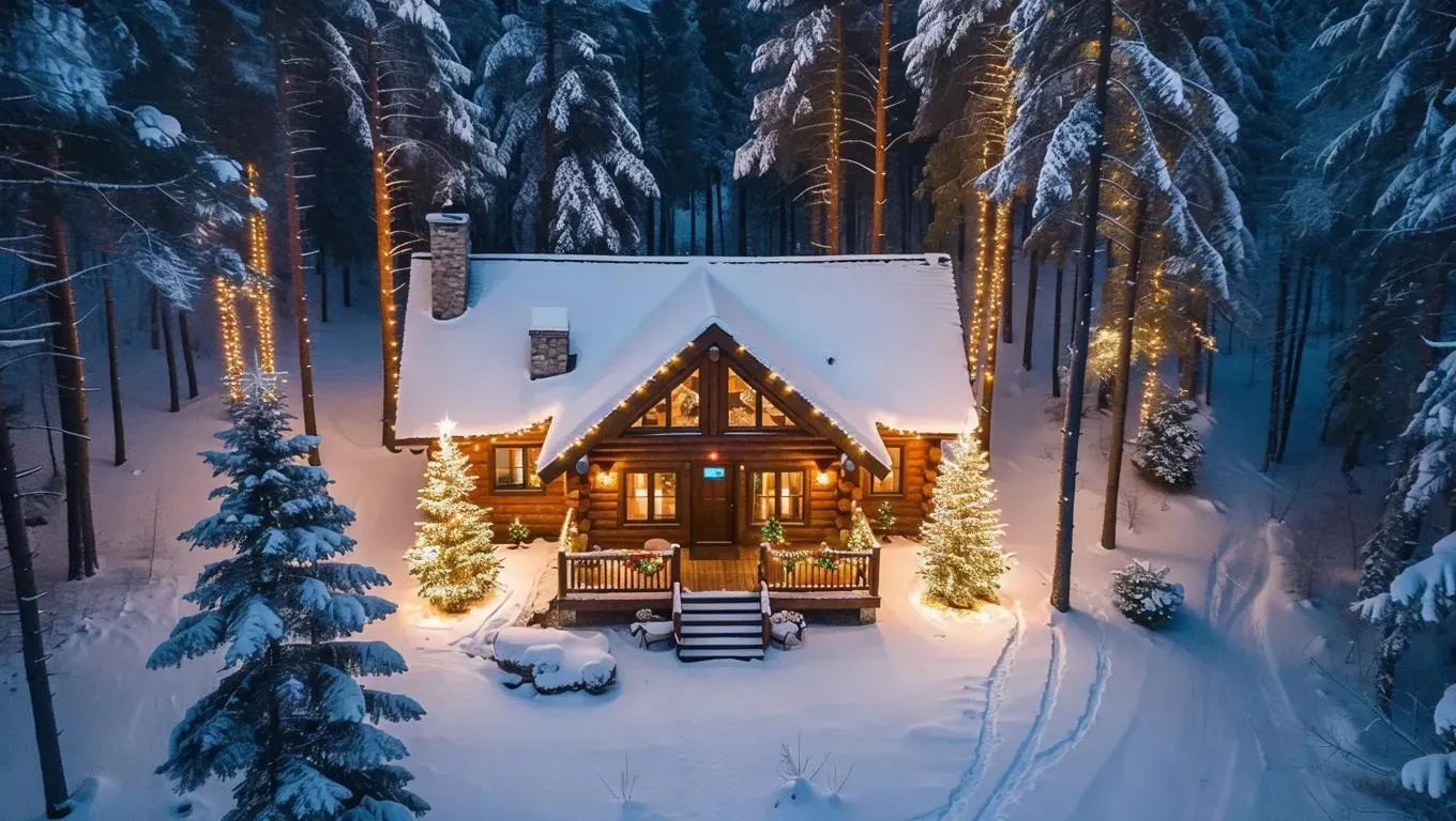 Create a magical snowy Christmas cabin scene with AI. Generate aerial views of a cozy brown cabin adorned with twinkling lights, nestled in snow-laden woods at night. Transform your vision into a festive winter wonderland using Vivago.ai's AI image tools for enchanting holiday visuals and professional-grade AI effects.