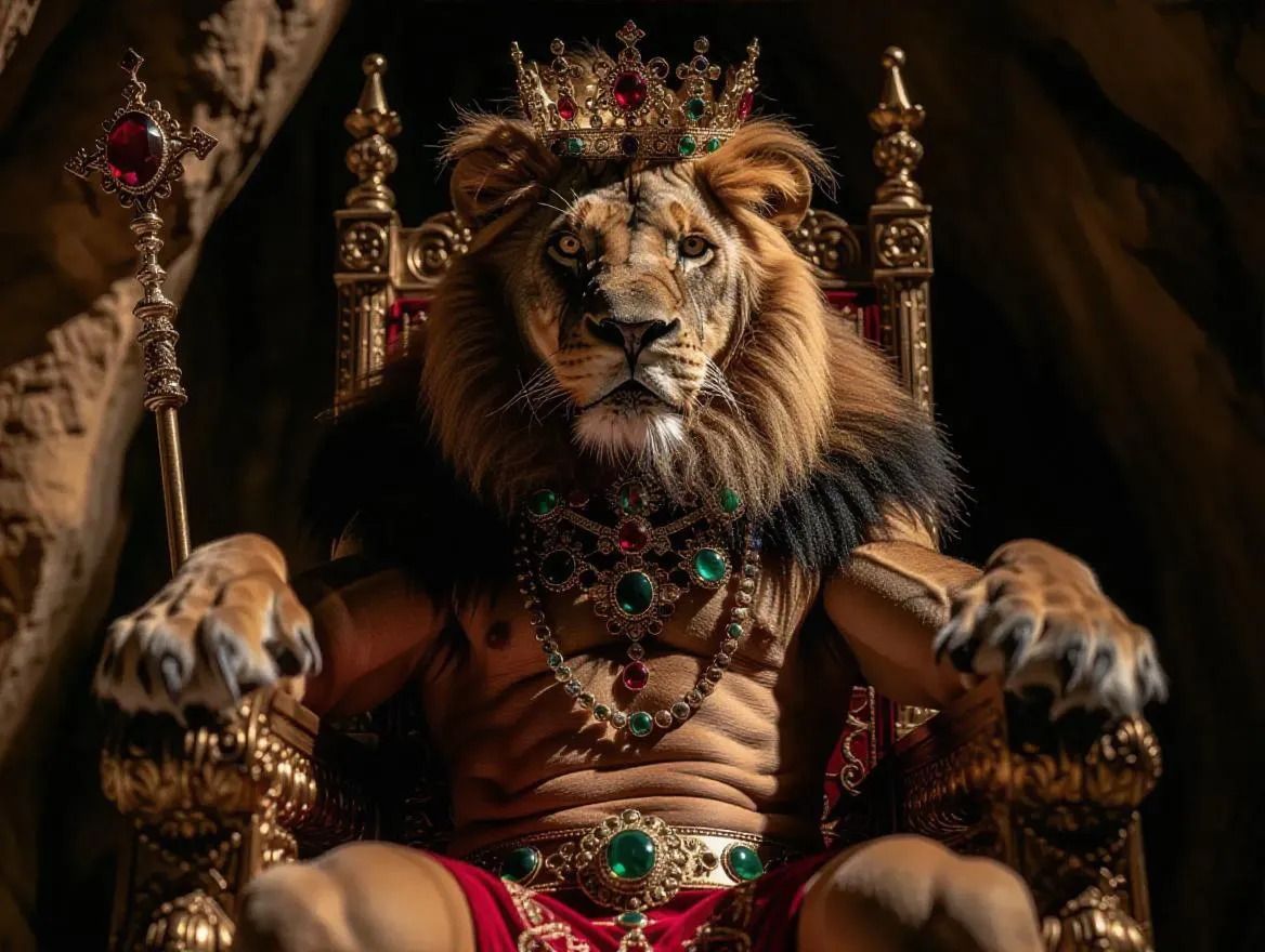 Old humanoid lion with battle scars on face and body, sitted on a king royal gold throne with skulls on the hand rests, wearing a gold diamonds topaz rubies emeralds saphirs crown on his head with a gold long staff with a big red diamond on top. In a cave. On a marble pedestal with a black and white tiles floor. Gazelle skin carpets. Dark. Shadows. Royalty. King.