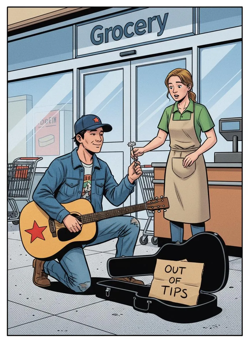 Generate AI custom comic panels using uploaded portraits. Preserve identity accurately with zero distortions. Scene: Busker outside a grocery offers a flower near clerk. Crisp bold lines, bright daytime colors, flat shading. Full-bleed image, no borders. Strict adherence to character details, "OUT OF TIPS" text on guitar case sign. Create unique, vibrant comic art with Vivago.ai.