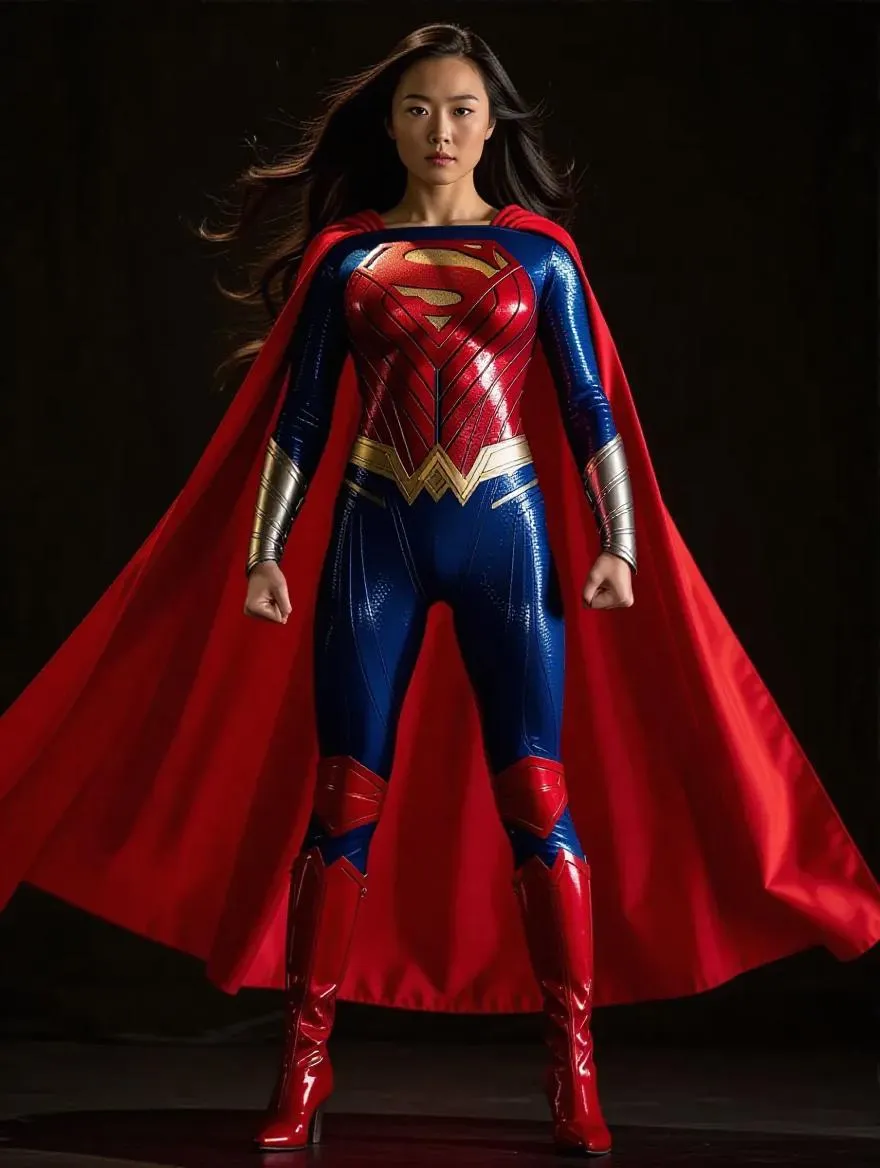 Experience AI-generated superheroine visuals with CN GIRL: a powerful Chinese superwoman in red-blue krypton fiber tights, wielding a diamond shield, flowing red cloak, and knee-high boots. Vivago.ai crafts dynamic 4K HDR (60 FPS) imagery, blending live-action detail with AI effects for striking, professional-grade results. Elevate creative projects with this bold fusion of cultural inspiration and cutting-edge AI innovation.