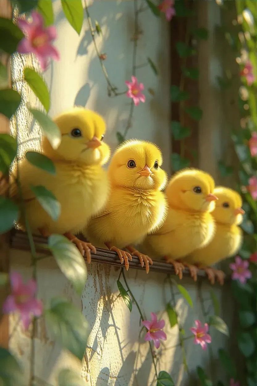 Generate a whimsical AI scene with 3 animated yellow chicks perched on a vibrant vine-covered wall. VivaGO's Sky Garden effect crafts fluffy feathers, gentle breeze movement, and cheerful visuals using advanced AI image generation tools for professional-grade creativity.