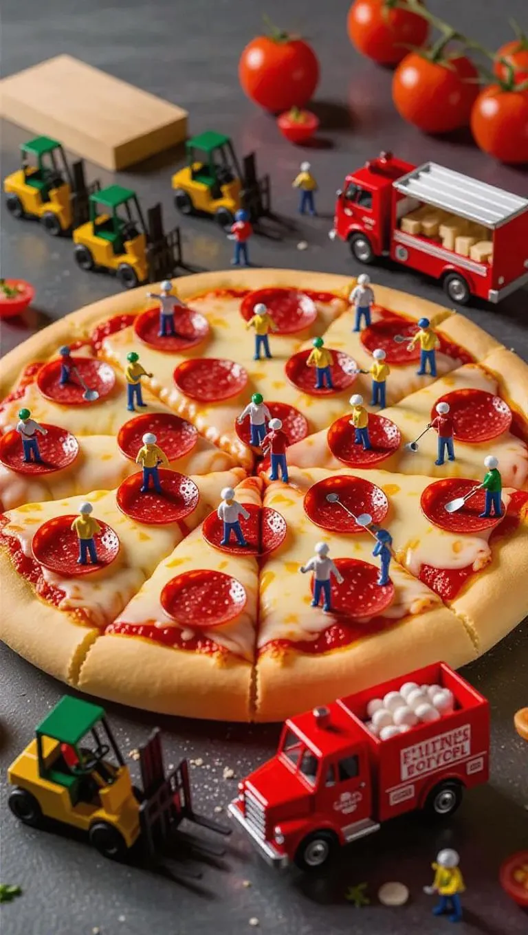 Transform text into whimsical visuals with vivago.ai's AI image generator. Craft a playful pizza construction site featuring miniature chefs, forklifts hauling pepperoni, firetruck-sprayed tomato sauce, and cherry tomato trucks. Effortlessly create imaginative, professional-grade scenes blending AI effects with creative storytelling.
