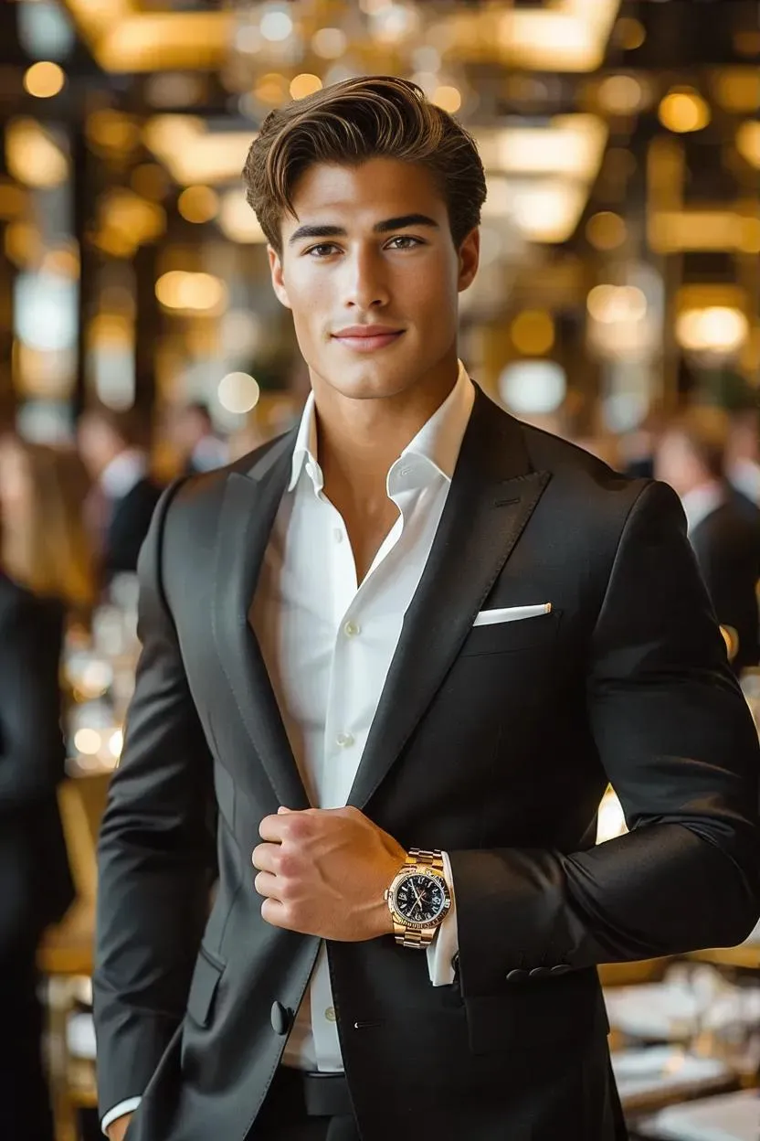 Generate AI visuals of a dashing 27-year-old man in a sleek black suit at a vibrant business event. Highlight Rolex watch, warm lighting, and sophisticated charm with vivago.ai's AI tools for professional, opulent imagery.