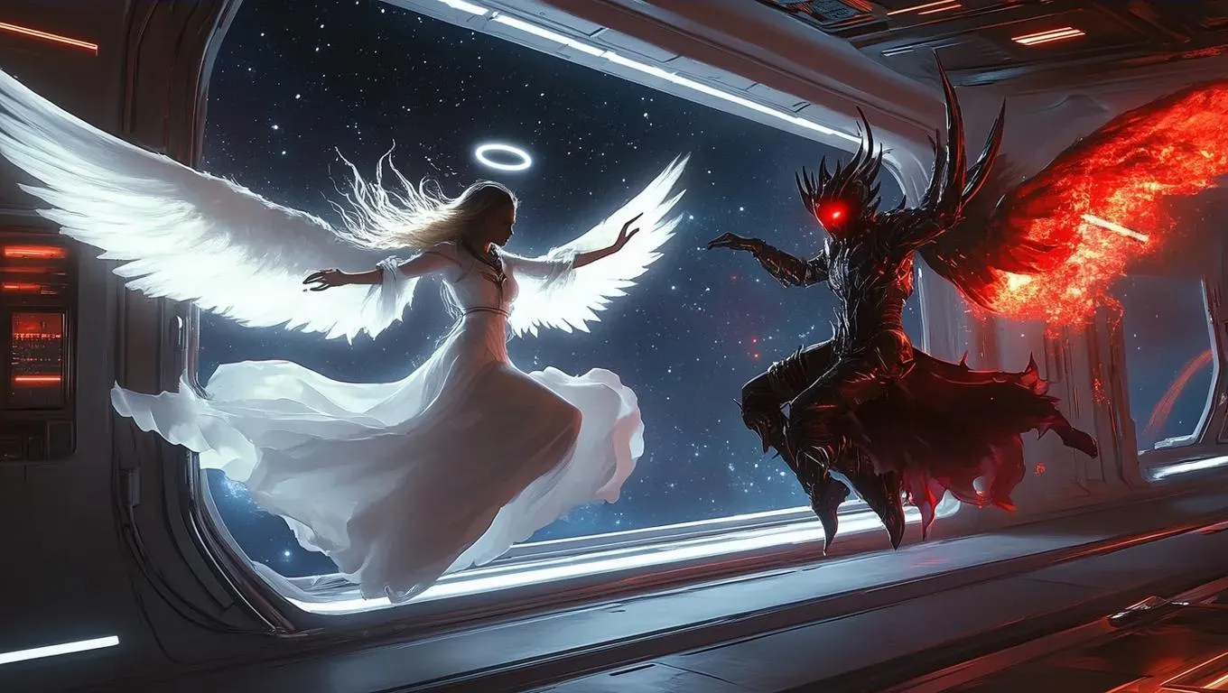 Create celestial vs. infernal AI art with vivid spaceship scenes. Generate glowing angelic-devilish dancers amid cosmic lights and starry backdrops using Vivago.ai's advanced image tools. Perfect for sci-fi visuals, dynamic light effects, and ethereal space narratives. Transform text prompts into heaven-meets-hell imagery with professional AI editing.