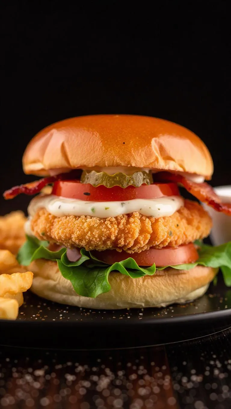 Crispy buttermilk-breaded fried chicken breast layered with house-made honey dill sauce, crispy bacon, fresh lettuce, juicy tomato, and tangy pickles on a toasted brioche bun. Gourmet sandwich perfection for savory, crunchy cravings—ideal for foodies seeking bold flavors and premium ingredients.