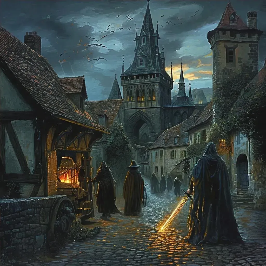 Epic fantasy AI art prompt: Master wields ancient glowing sword against curse-casting witch in medieval Prague showdown. Generate mystical battle scenes with dark magic effects, cursed villagers, and arcane weaponry using AI image tools for dark fantasy visuals. Perfect for creating sorcery-themed digital art and magical conflict imagery.