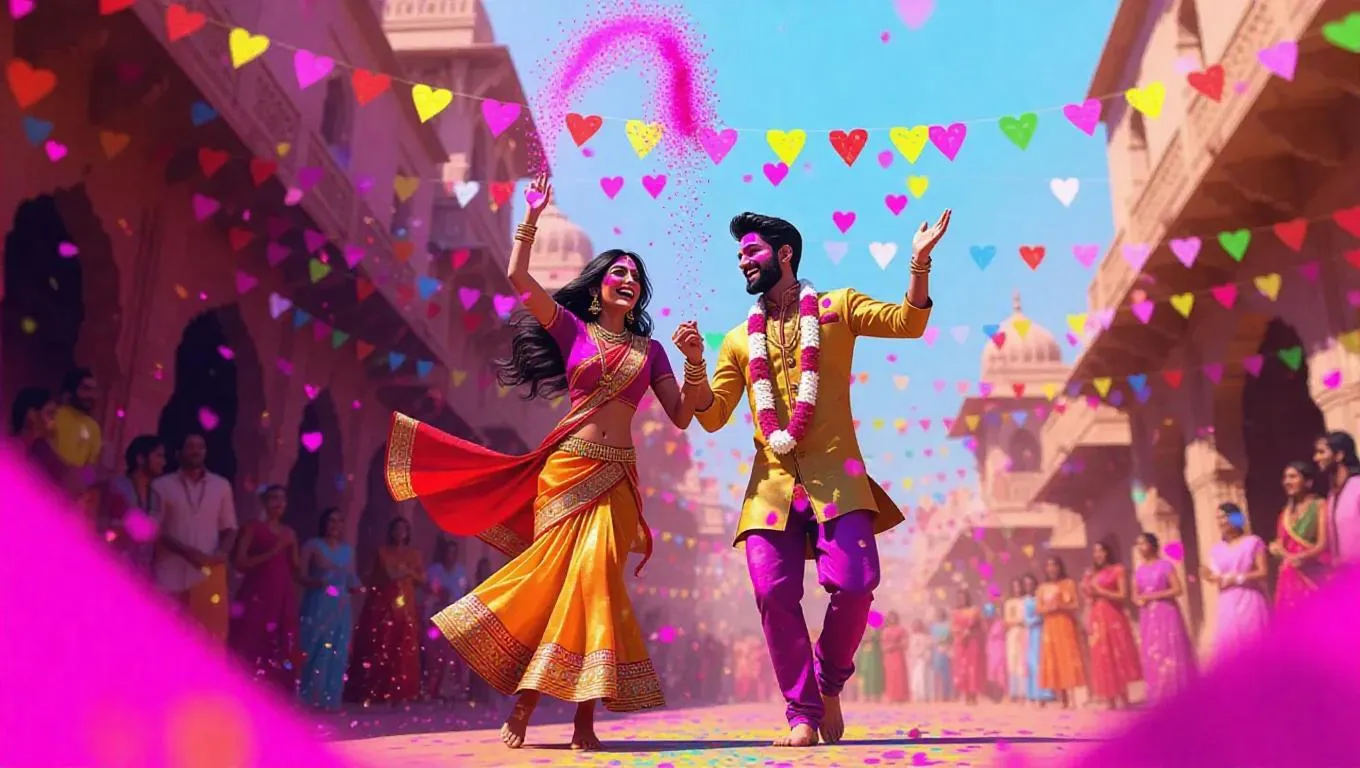 Generate vibrant AI cartoon art of a couple celebrating Holi with colorful splashes and playful interactions. Perfect for festive social media posts, digital illustrations, or whimsical greeting cards. AI-powered tools transform text into dynamic, culturally rich visuals blending romance and lively cultural festivities.
