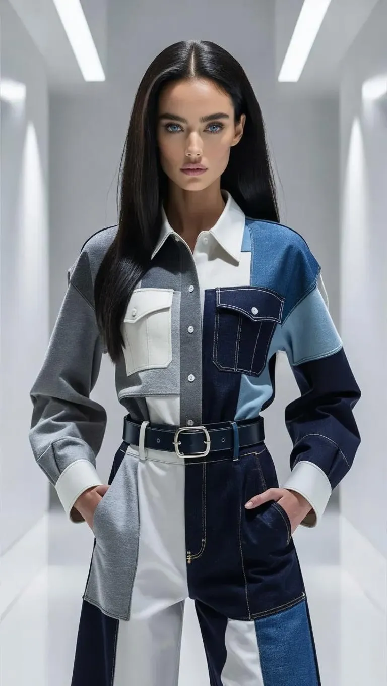 Explore the Spring-Summer 2025 collection featuring a European woman with black hair, blue eyes, and light skin in a futuristic patchwork sweatshirt. Styled with navy blue denim pants, a belt, and high heels. Full-body fashion shot on a white background, highlighting contemporary trends and AI-generated design precision.