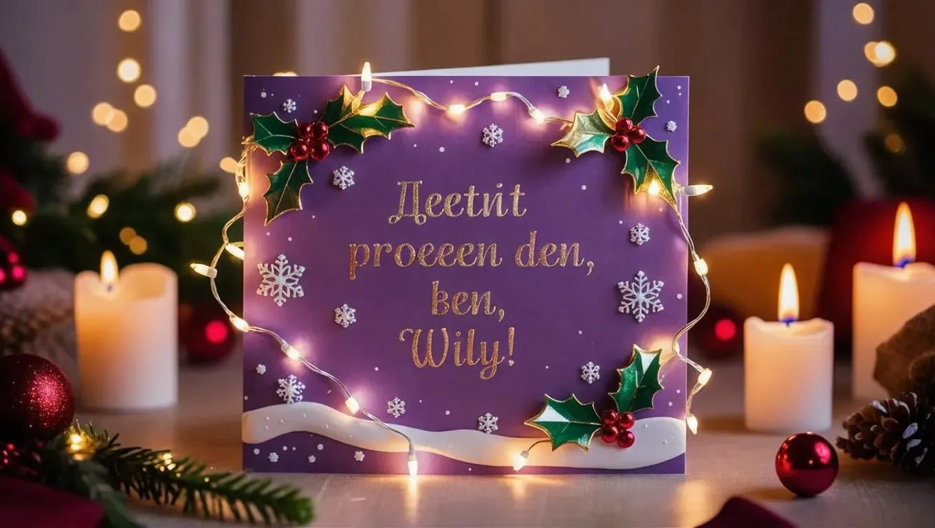 Create a vibrant AI-generated purple birthday card blending Christmas magic with personalized Cyrillic text "Честит рожден ден, Вили!" using VivaGo.ai. Craft festive AI designs merging holiday cheer and birthday celebrations for unique, eye-catching greetings. Perfect for dual-themed celebrations with professional editing tools.