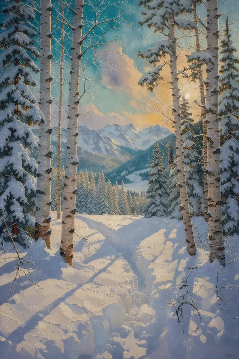 Generate AI winter forest art with thick impasto oil textures and palette-knife snowdrifts. Sunlit cobalt skies cast amber shadows over snowbanks, contrasting cadmium yellow peaks against ultramarine depths. Features frozen birch trunks, lavender-hued mountains, and turquoise snow reflections. AI-powered tools recreate gritty ochre brambles, crimson rosehips, and swirling ice crystals for professional-grade atmospheric scenes. Transform prompts into vivid text-to-image winter landscapes.