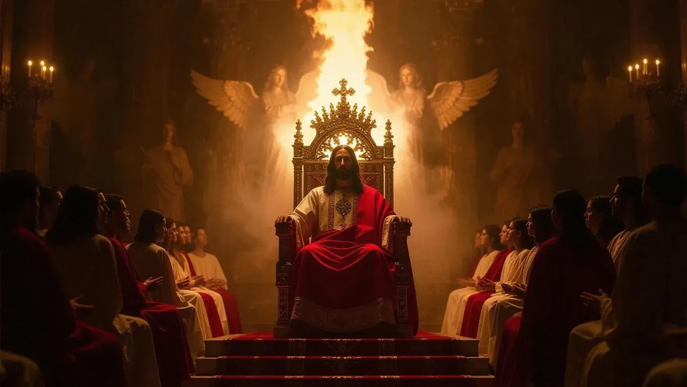 Create AI-generated biblical art of Jesus on the divine Throne of David with glowing fire, angels, and holy atmosphere inspired by Isaiah 9:7. Transform prompts into sacred visuals using AI tools for celestial imagery, royal robes, and Christian symbolism. Craft professional religious art effortlessly.