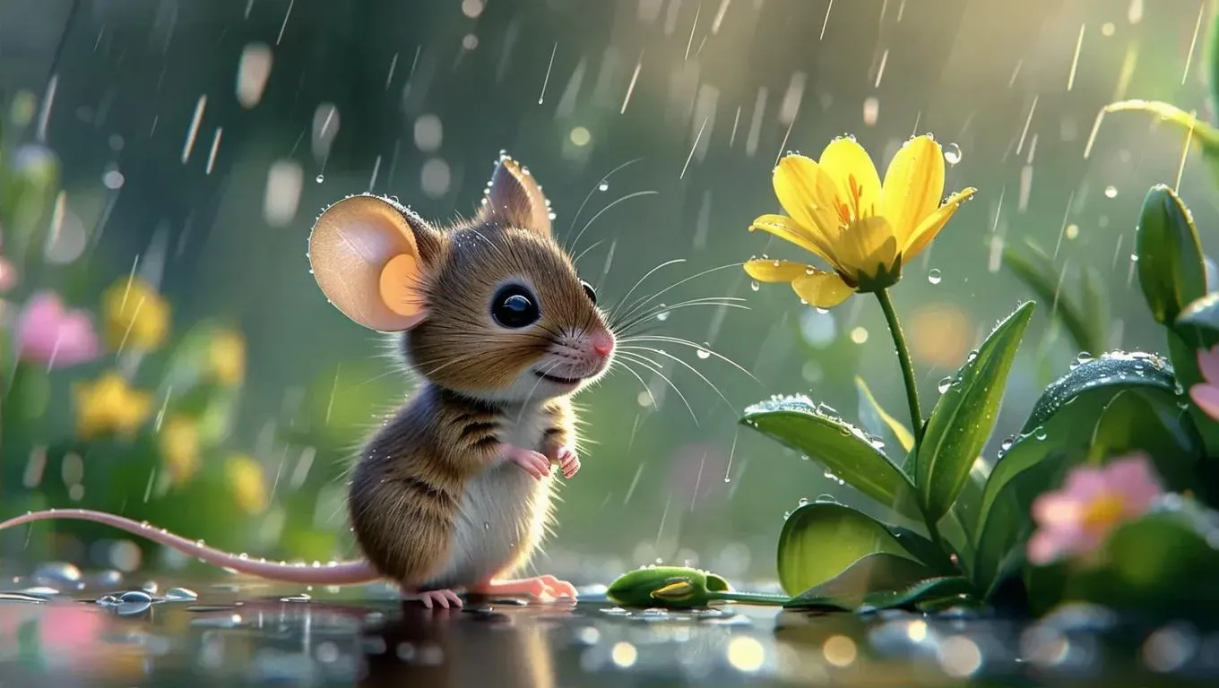 Adorable Pixar-style mouse under a flower on a rainy day. Muted pastel colors, insanely detailed & realistic, high-definition AI-generated art. Create enchanting visuals with VivaGo's AI tools for professional-grade, high-resolution adorable characters and whimsical scenes.