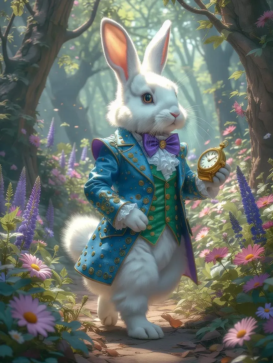Generate a whimsical AI image: A sophisticated white rabbit in a vibrant blue, green, violet, and white tailsuit holding an Ancient Golden watch, walking through an enchanted magic forest brimming with giant flowers, fairies, and towering trees. Transform your vision with VivaGO.ai's art creator.