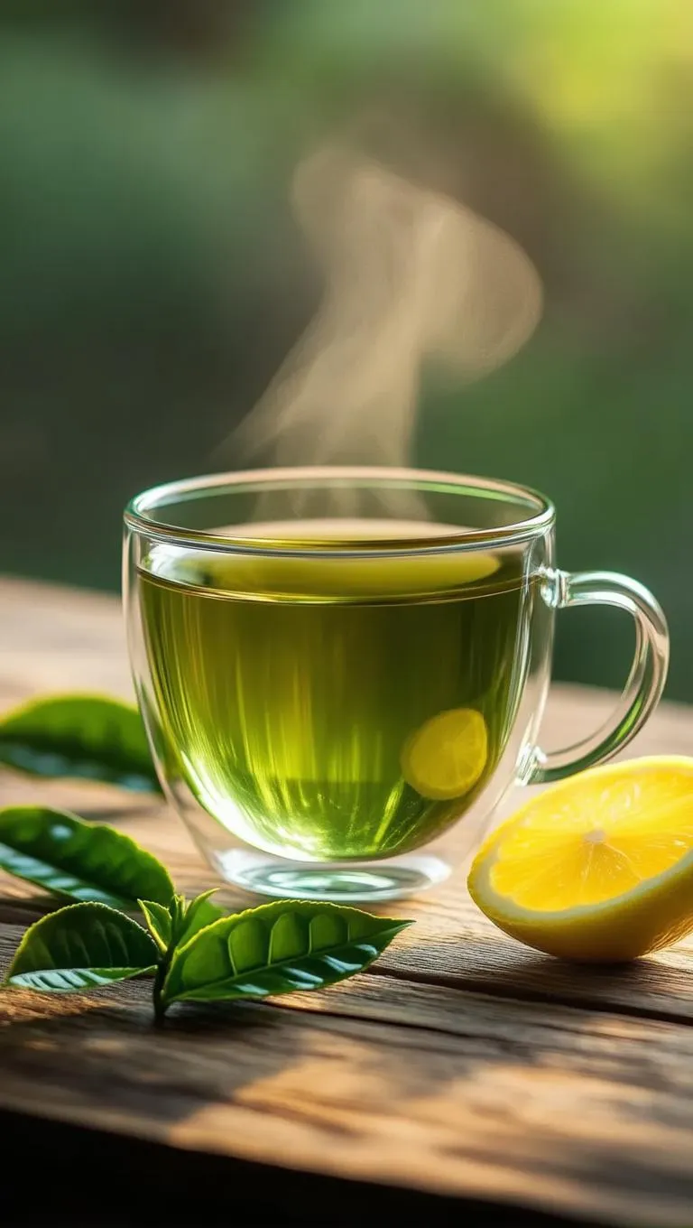 Capture serene green tea wellness imagery with AI. A steaming clear glass mug reveals golden-green hues, fresh leaves, and lemon slice on natural wood. Soft light highlights steam, purity, and health-focused ambiance. Minimal blurred background enhances calm refreshment. Ideal for wellness, lifestyle, or beverage content—crafted for tranquility and natural appeal.