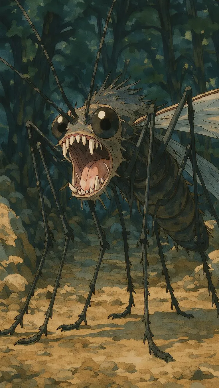 a screenshot from a ghibli anime film of a grotesque lovecraftian mosquito creature