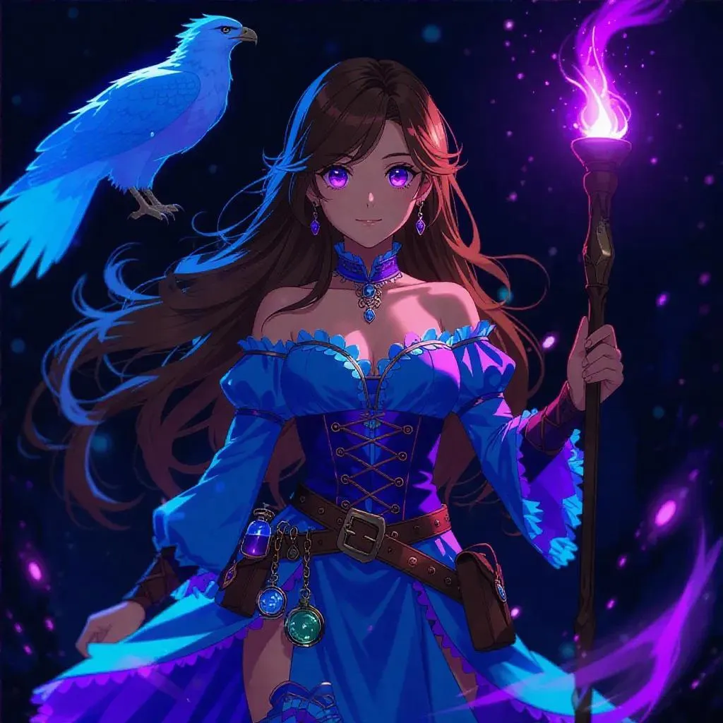 Generate vibrant AI anime art with mystic fantasy elements. Neon magic, UV/aquamarine aurora effects, and glowing eyes bring life to this alchemist adventurer. Featuring light brown hair with neon purple highlights, a renaissance-inspired dress, mystical staff, and luminous bird companion. Perfect for anime fans seeking magical forest scenes, neoncity vibes, and iridescent color reflections.