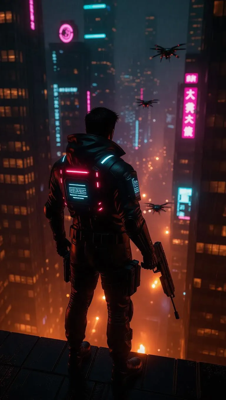 Immerse in a dystopian cyberpunk scene: lone warrior clad in neon-lit armor stands atop ruins, gazing over a collapsed metropolis ablaze with holograms, drones, and neon rain. AI-generated art captures cinematic grit, glowing visors, futuristic weapons, and wet, reflective surfaces. Perfect for creating dark, futuristic visuals with professional-grade AI effects and hyper-detailed apocalyptic atmosphere.