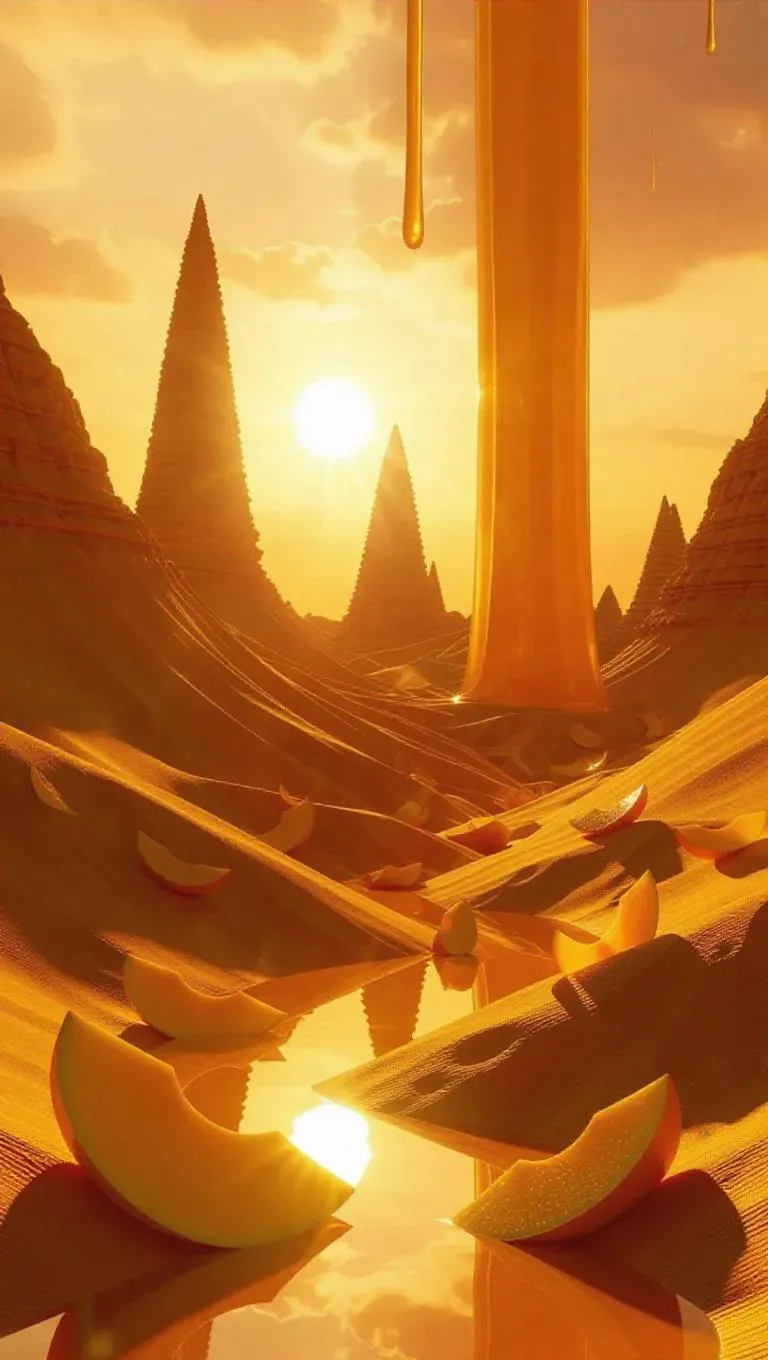 Explore "Mangorift: The Horizon That Drips" – an AI-generated surreal desertscape where mango-slice dunes meet golden sky ribbons. Discover secret fruit temples, shimmering juice mirages, and memory-trading travelers in this AI art realm. Crafted with vivago.ai, blending fantasy storytelling, dual suns, and juicy textures for visionary creative inspiration.