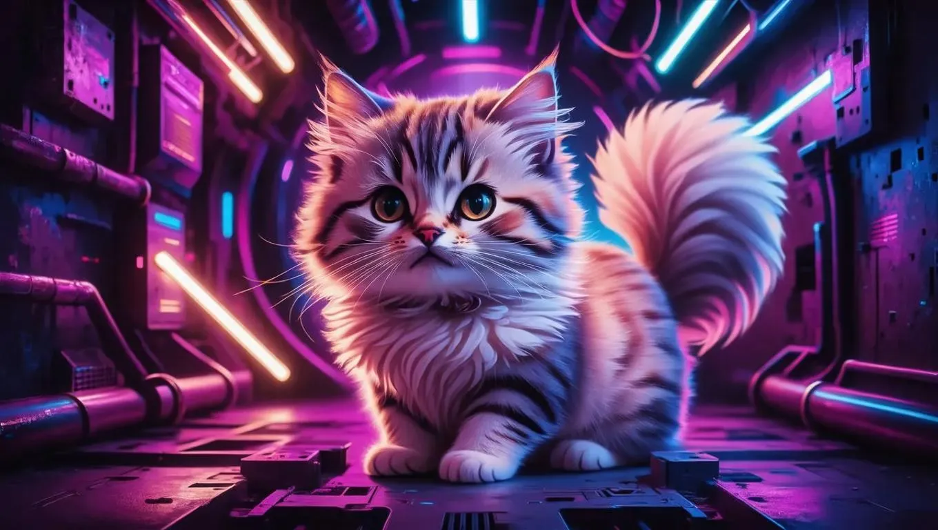 Generate a vibrant cyberpunk portrait of a cute cat with a fluffy tail using AI. Enhance neon lighting, cyberpunk aesthetics, and intricate details with vivago.ai's advanced image tools. Transform text prompts into striking visuals effortlessly, blending futuristic elements and adorable charm for professional-grade AI-generated artwork.