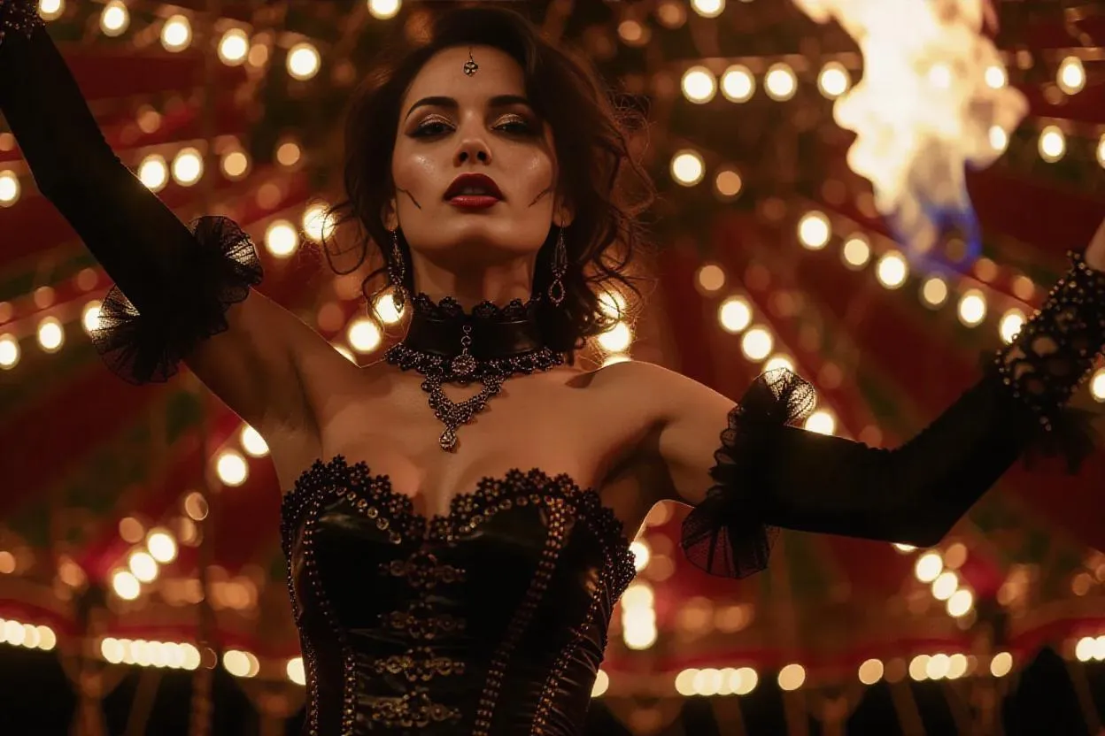 Vivid AI-generated photography of a passionate Mexican fire performer in a steampunk-inspired circus arena. Capturing dynamic flames, intricate costumes, and dramatic lighting for striking visual storytelling.