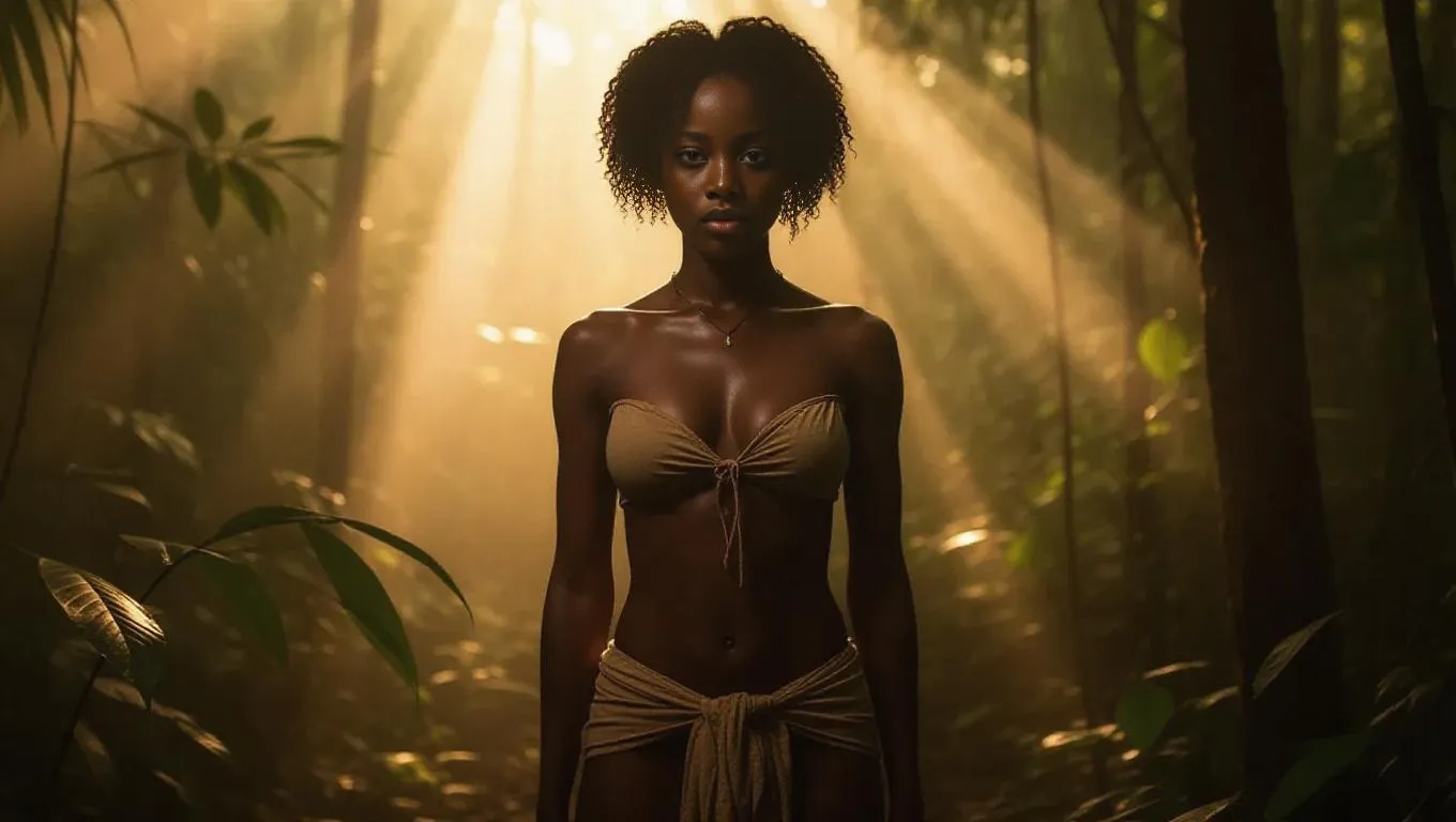 Hyper-realistic vivid digital art, medium shot, a young black woman stands facing the camera, wearing a loincloth, in a misty forest. Cinematic lighting, soft diffused light filters through the mist, warm golden tones on her skin. Dew-kissed leaves, misty atmosphere, earthy tones, lush greens. Best quality, 8k resolution, incredibly detailed, moody atmosphere, atmospheric perspective, soft focus on background, sharp focus on subject.