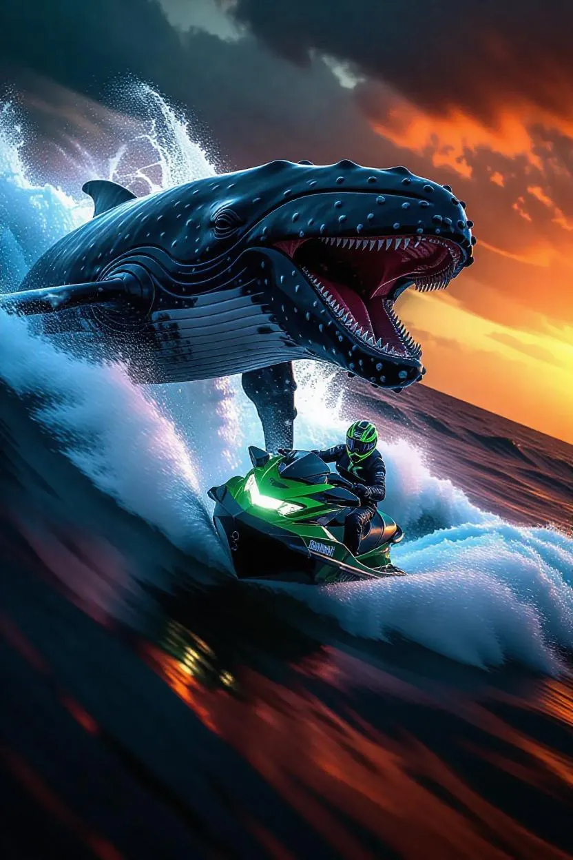 AI-generated hyper-realistic horror scene: Futuristic Kawasaki jet ski flees through stormy ocean vortex as translucent Bowhead whale with jagged teeth emerges behind. Close-up terrified boy clings to father amid psychedelic fractal chaos. Motion blur, dramatic lighting, vibrant colors, and unsettling acid-core aesthetic. Captures high-speed aquatic terror with detailed transmogrification effects.