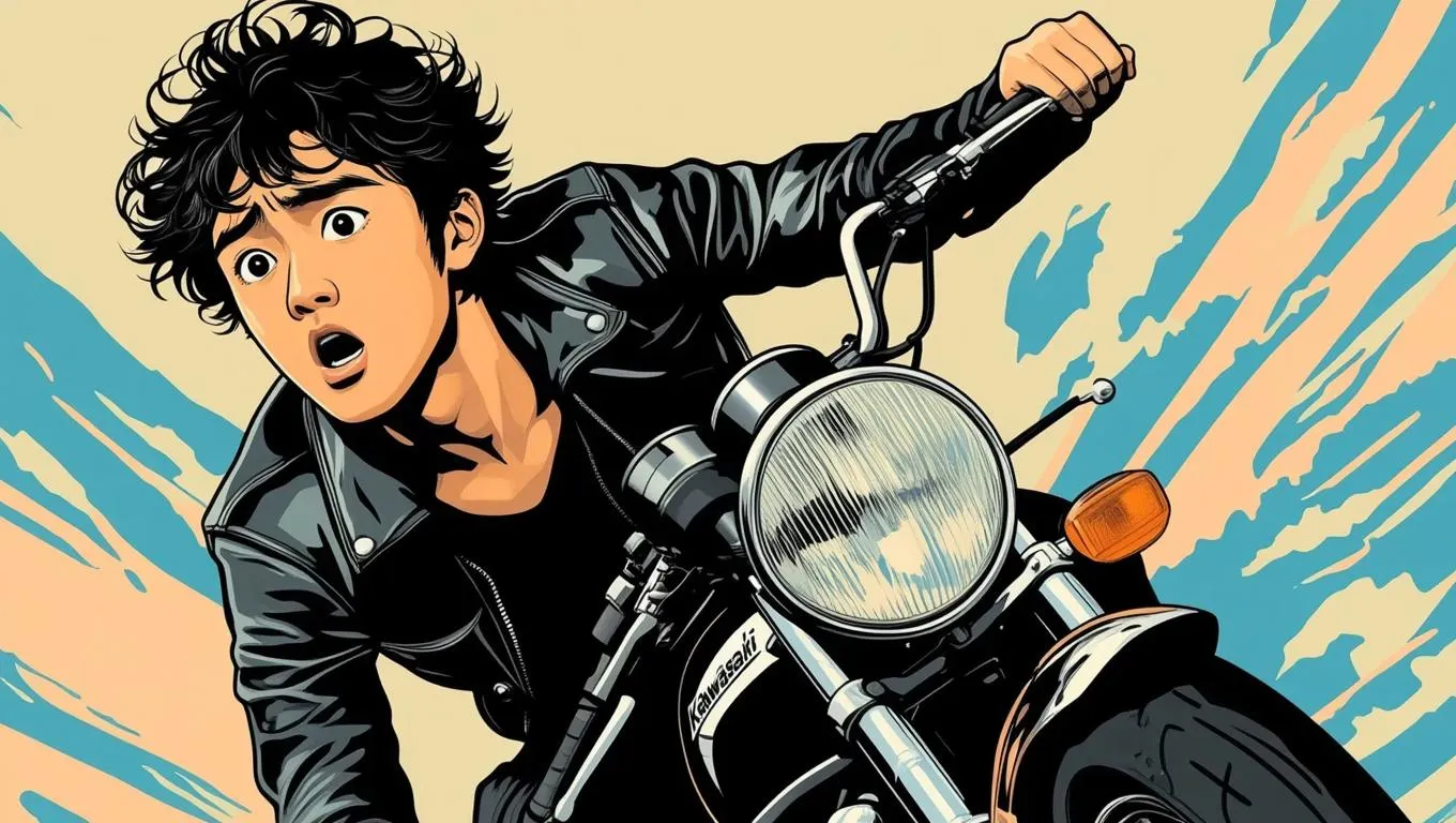 Transform text into vibrant AI-generated Pop Art & Manga-style visuals. Depict a 25-year-old Asian man with short wavy black-blonde hair riding a classic Kawasaki motorbike mid-air, capturing fear and motion. Vivago.ai blends dynamic floating scenes, bold colors, and comic-inspired effects for striking AI art. Elevate creative projects with professional editing tools and anime-inspired AI enhancements.