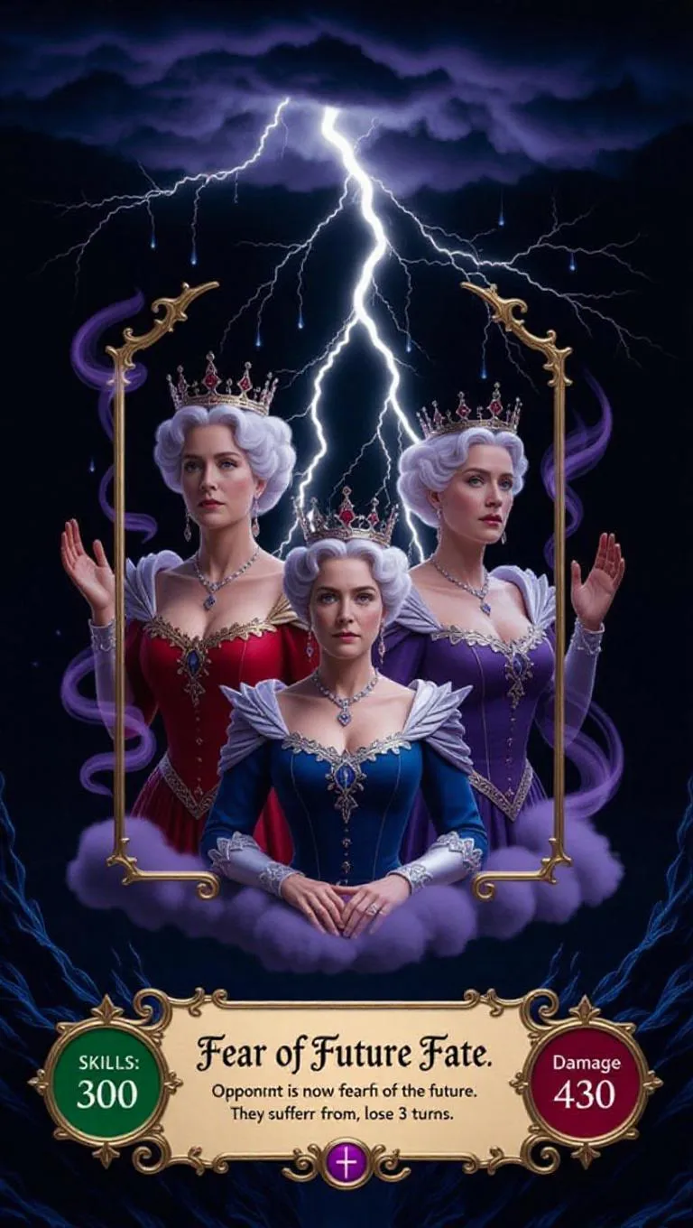 A majestic fantasy electric lightning storm conjures old and young versions of the same queen, adorned on a 3D dimensional game card. The card features a rectangle at the bottom with elegant fantasy text reading "Fear of Future Fate". Below, a description states "Opponent is now fearful of the future. They suffer from insanity, lose 3 turns". Bottom left circle with "Skills: 300". Bottom right circle with "Damage: 430". Ethereal clouds, shimmering tears, intricate details, glowing aura, royal regalia, mystical realm backdrop, celestial light, swirling mist.