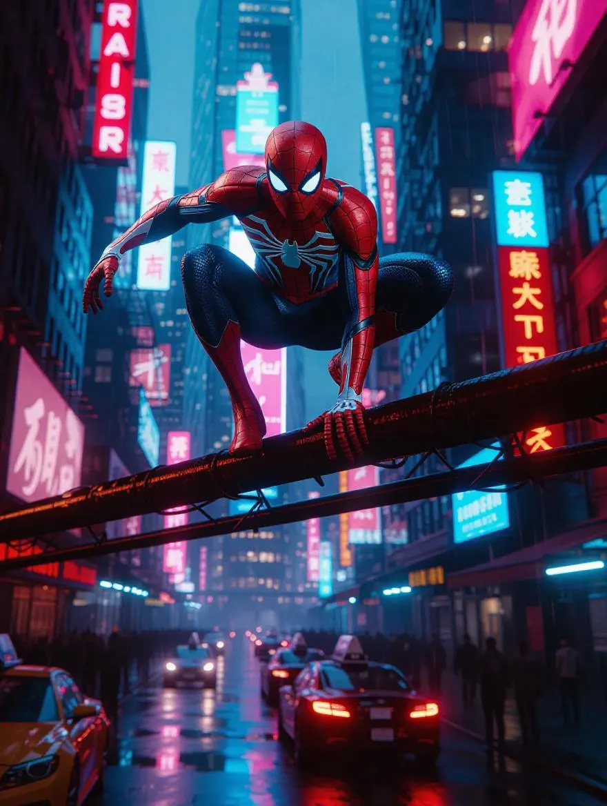 A futuristic cyberpunk metropolis pulses with neon-lit skyscrapers, holographic billboards flickering in the rain-soaked air. Spider-Man perches atop a rusted steel beam, his nano-tech suit glowing with pulsating cyan circuitry and crimson accents, adaptive armor plates shifting dynamically. Below, levitating cars weave through floating market stalls, augmented humans and drones crowd the smoggy streets. Dramatic backlighting casts his dynamic pose in silhouette against a colossal hologram of a snarling corporate logo, glowing spider-silk threads trailing into the electric-blue haze. Ultra-detailed 8K, cinematic wide-angle shot with lens flare and motion blur from passing hoverbikes, blending dystopian grit with hyper-modern sleekness.