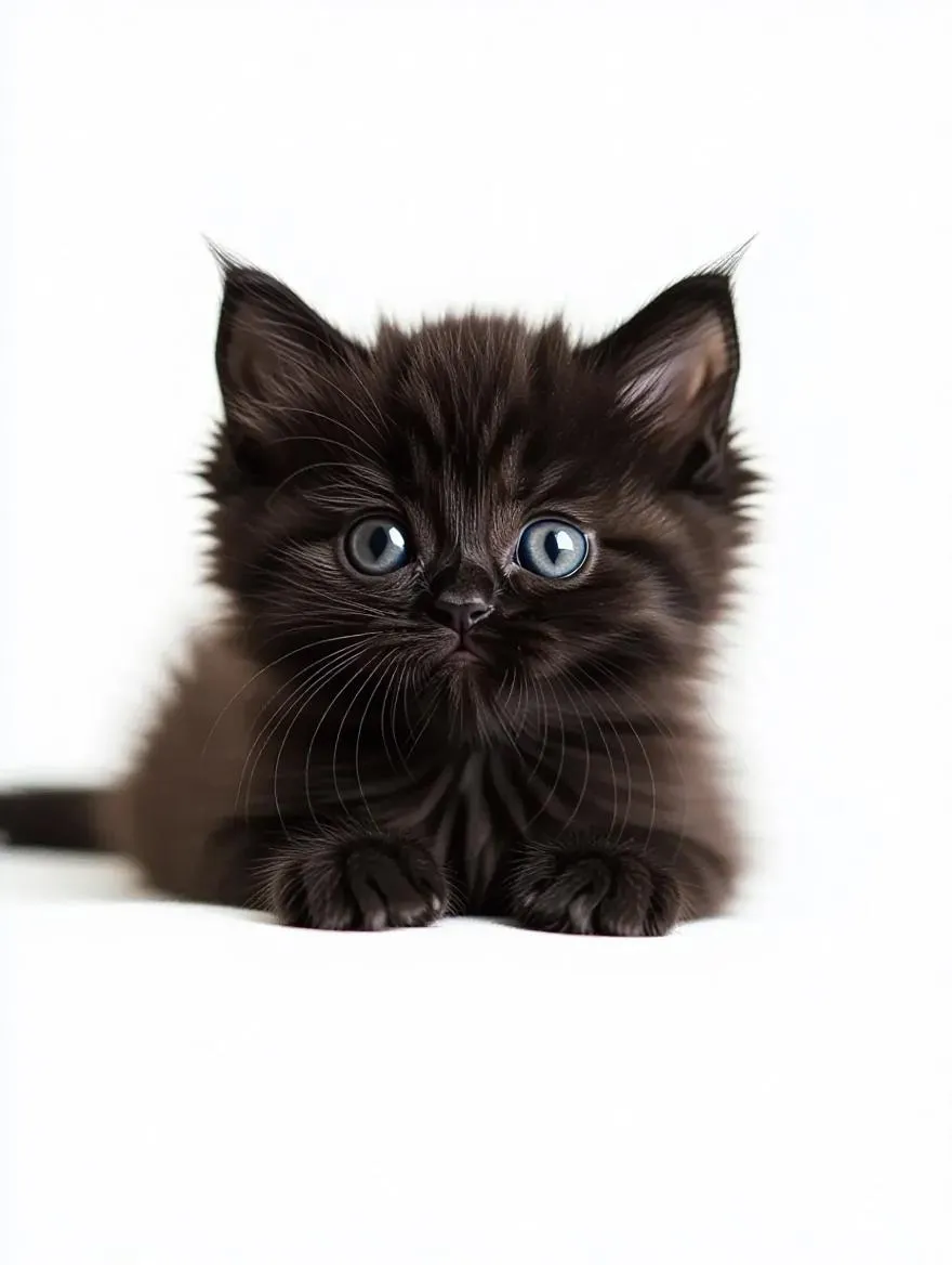 Generate an adorable black hairy kitten with VivaGo.ai's AI tools. High-quality Sony FX7-style image, crisp white background, and lifelike details. Perfect for pet lovers, content creators, or social media. Elevate your projects with AI-generated cuteness, professional editing, and seamless visual storytelling.