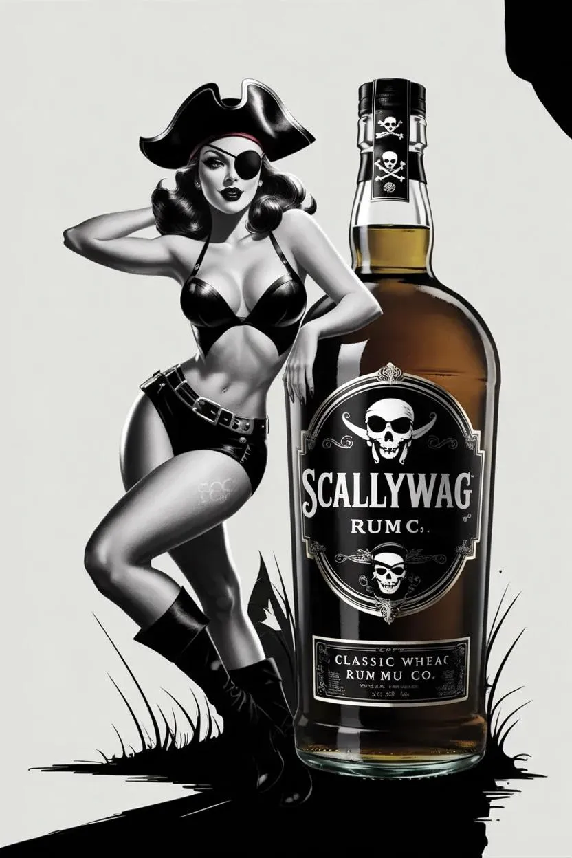 Create a bold pirate-themed cartoon silhouette: sexy female character leans against a giant vintage "Scallywag Rum Co." bottle in black-and-white comic style. AI-generated artwork on clean white backdrop for striking retro branding visuals, perfect for logos, labels, or edgy pirate-themed designs.