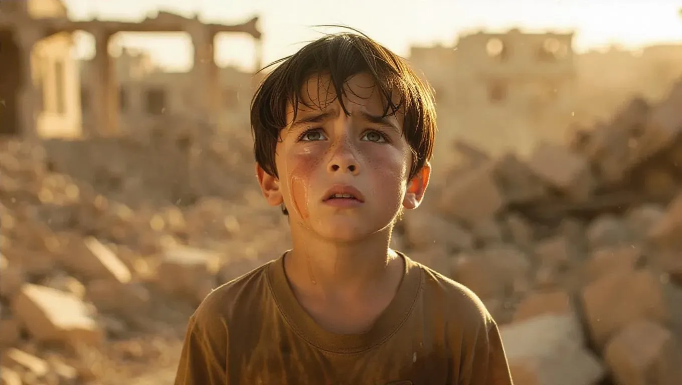 A young boy, tears streaming down his face, gazing intensely with a heartbreaking sorrow, embodying the trauma of war, weeping uncontrollably, standing amidst a backdrop of utter devastation, his small frame twisted in anguish, dynamic pose conveying desperation, hyper-realistic, cinematic style, shallow depth of field, Nikon D850, 24-70mm f/2.8E ED VR lens, focused on the boy's anguished expression, warm, golden light casting long shadows across the ruins, emphasizing the boy's isolation and despair.