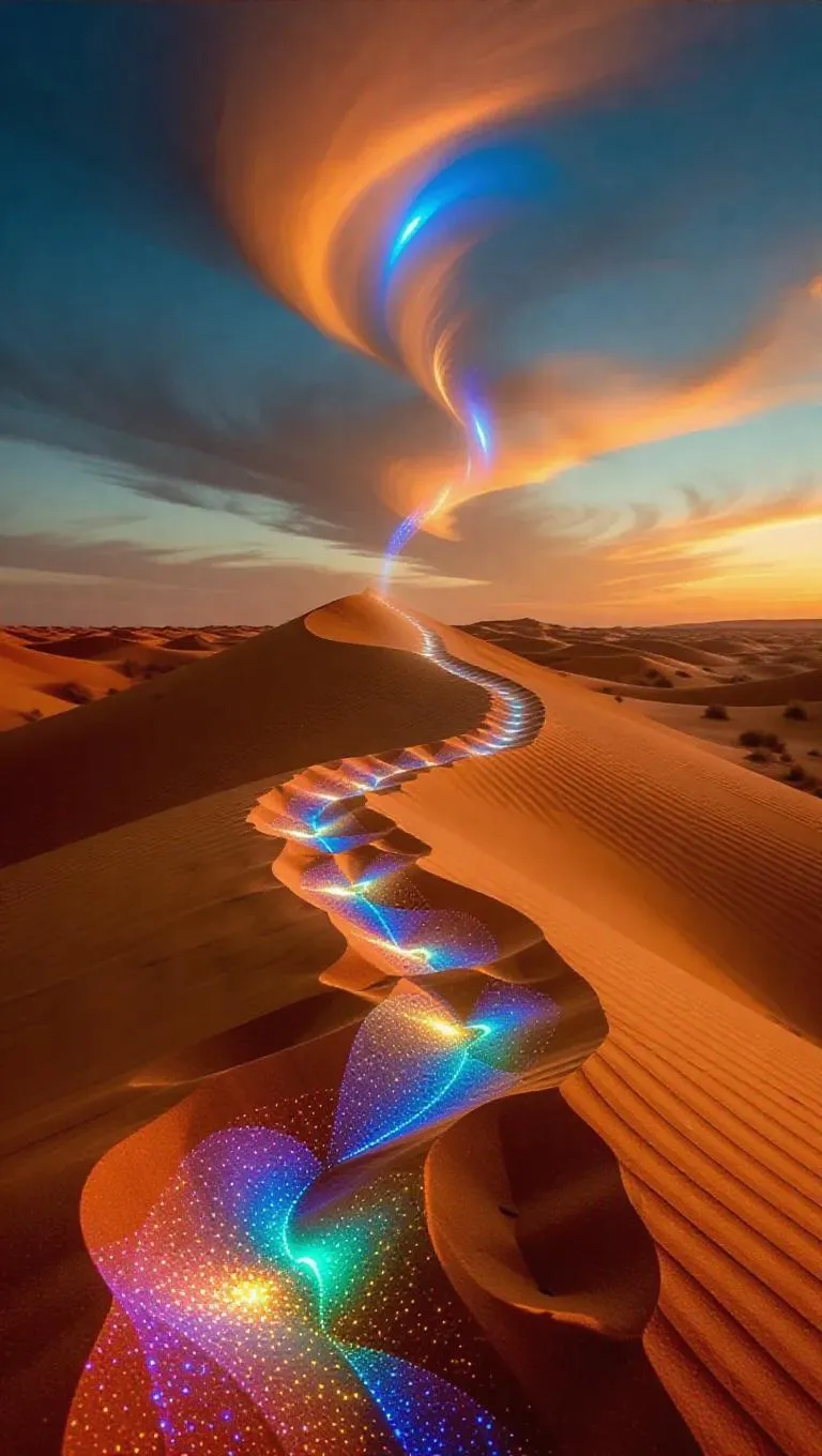 Create mesmerizing AI-generated art with shimmering opal dunes, glowing sand tornadoes, and elusive light beings. Transform text prompts into surreal desertscapes using Vivago.ai's advanced AI effects for ethereal, mirage-like visuals. Craft otherworldly scenes with crushed-glass sands and refractive light illusions – perfect for fantasy art, digital projects, and immersive storytelling.