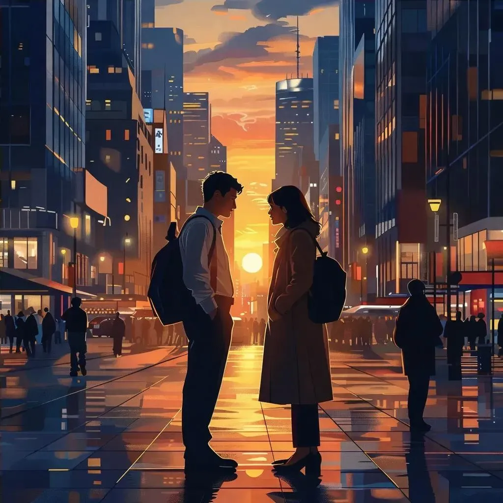 Capture a romantic urban sunset with two silhouettes reuniting at a bustling city square. This high-detail line art illustration depicts their daily after-work rendezvous, set against a softly glowing cityscape. AI-generated side view emphasizes longing and excitement, perfect for evocative storytelling and professional visuals.