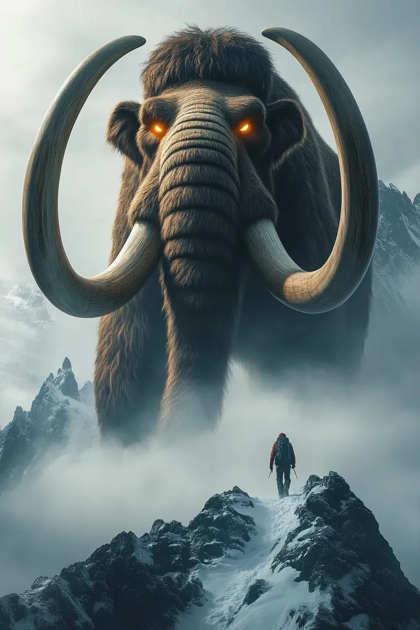 Generate a chilling AI image of a menacing mammoth stalking a hiker on a rugged mountain summit. Capture this eerie wilderness encounter with hyper-detailed realism, blending primal terror and dramatic landscapes. Ideal for horror visuals, adventure storytelling, or paleontology-inspired content creation using cutting-edge AI image generation technology.