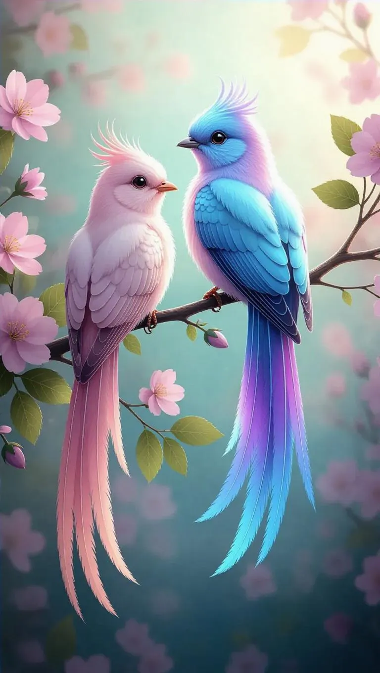 Vivid fantasy birds with intricate pink, purple, and blue feather details perch on a branch amid a dreamy floral backdrop. Ideal for kids' nature-themed decor, this AI-generated image blends soft pastel hues, artistic realism, and whimsical charm for enchanting storytelling or vibrant wall art.