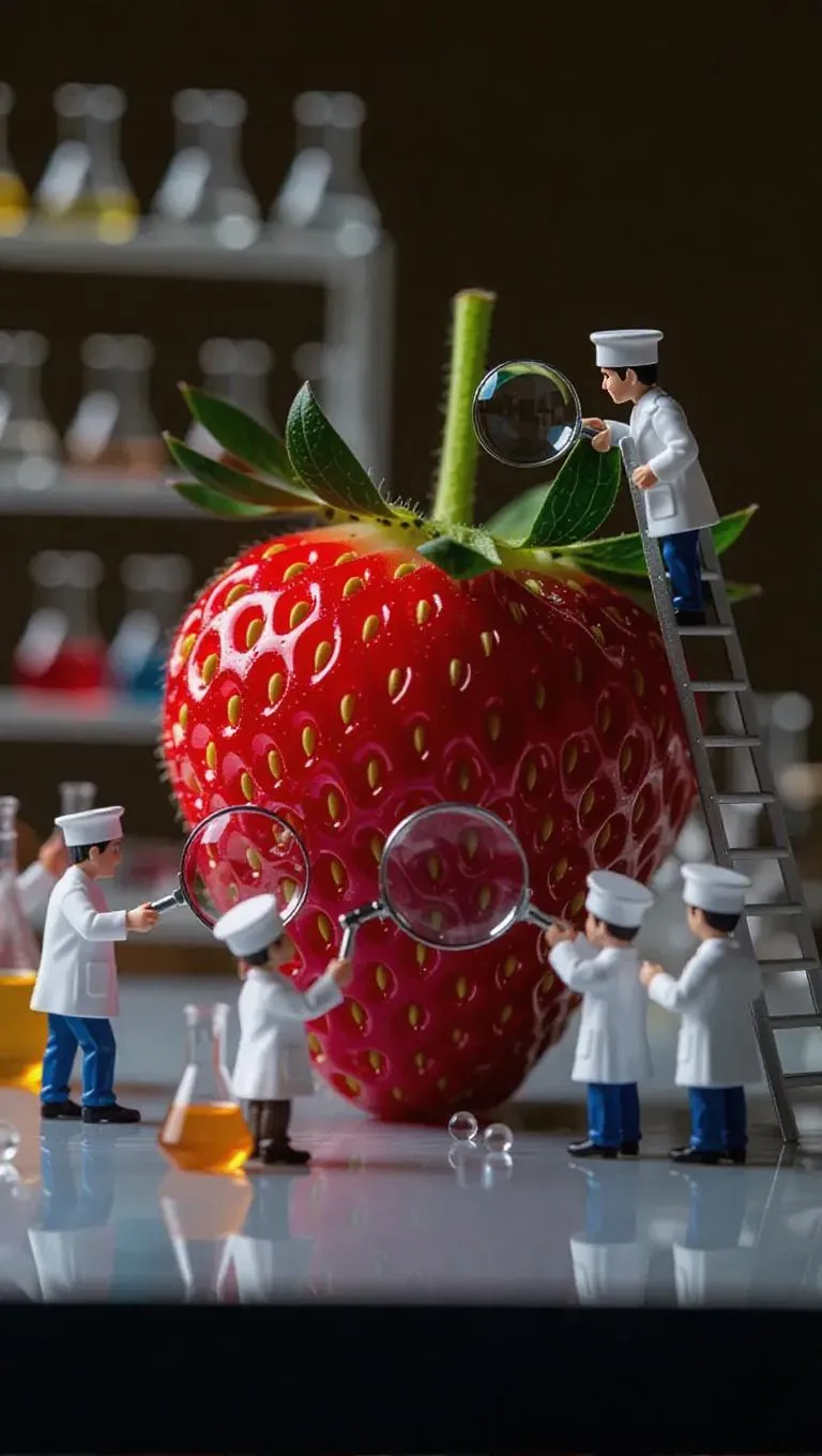 Generate whimsical AI visuals of miniature scientists in lab coats analyzing a colossal strawberry with magnifying glasses, droppers, and lab tools. Vivago.ai crafts hyper-detailed, playful scenes blending science and creativity for professional-grade AI art, animations, or videos.