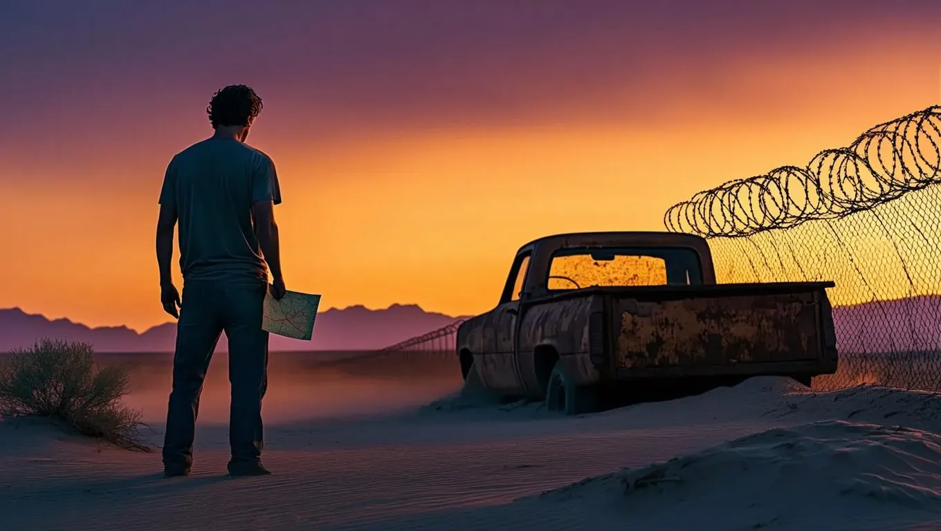 Craft cinematic realism with hyper-detailed desert border scenes at golden hour. AI generates a lone man's silhouette against barbed-wire horizons, rusted trucks, and symbolic maps. Hollywood-style lighting, social realism themes, and photographic precision blend with poetic stillness. Vivago.ai merges tension, shadows, and minimalist landscapes in AI-generated hyperrealism. Transform prompts into symbolic visuals with professional-grade cinematic imagery.