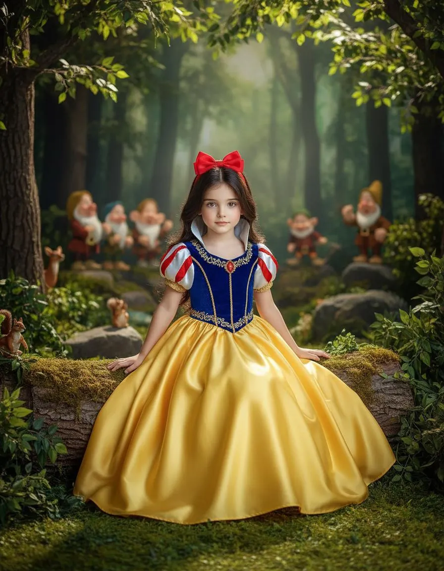 Transform the reference child into a Snow White-style portrait photoshoot. Preserve the child’s facial features, hairstyle, and body shape from the reference image. The child is dressed in a Snow White-inspired gown with puffed white sleeves, a blue bodice with gold trim, and a yellow skirt, with a bright bow in her hair. She is sitting gracefully in a natural forest-themed studio set, surrounded by realistic fairy-tale props and subtle dwarf figures in the background. The scene is captured as a photorealistic, high-quality studio photograph, with cinematic lighting that creates soft highlights and natural shadows. The overall mood is realistic, elegant, and magical, like a true professional fantasy portrait photography.