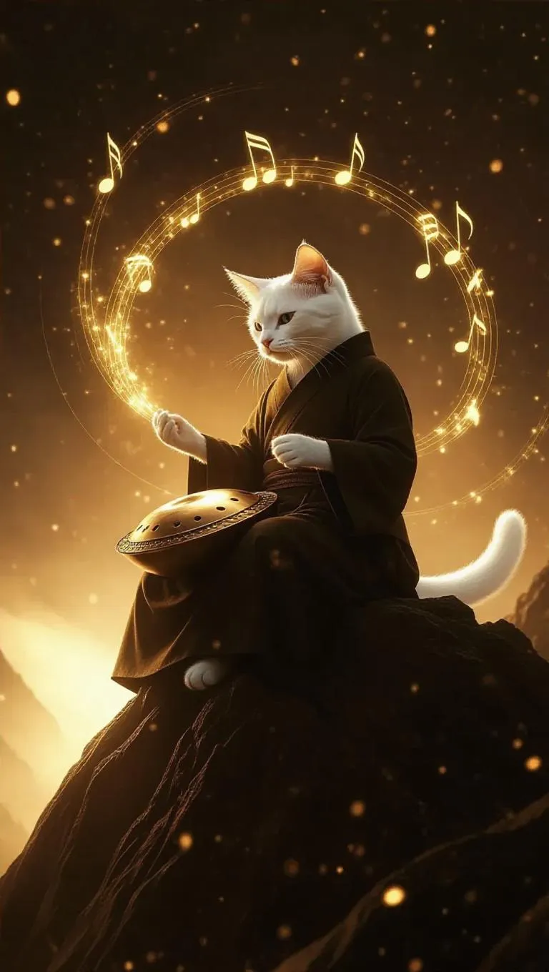 Craft AI-generated fantasy art of a mystical white cat monk playing a handpan atop a mountain. Golden musical notes, ethereal lines, and warm magical ambiance blend in this professional-grade fantasy painting. Transform prompts into enchanting visuals with vivago.ai's AI art tools.
