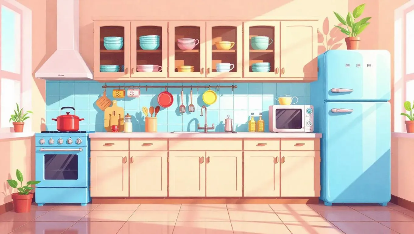 Transform your vision into vibrant 90s video game vector art with this AI-generated cartoon-style kitchen. Featuring beige cabinets, glass doors displaying plates/cups, and a nostalgic retro aesthetic in Ultra HD HDR. Perfect for dynamic, colorful designs blending game-inspired cartoon visuals with professional AI editing tools.