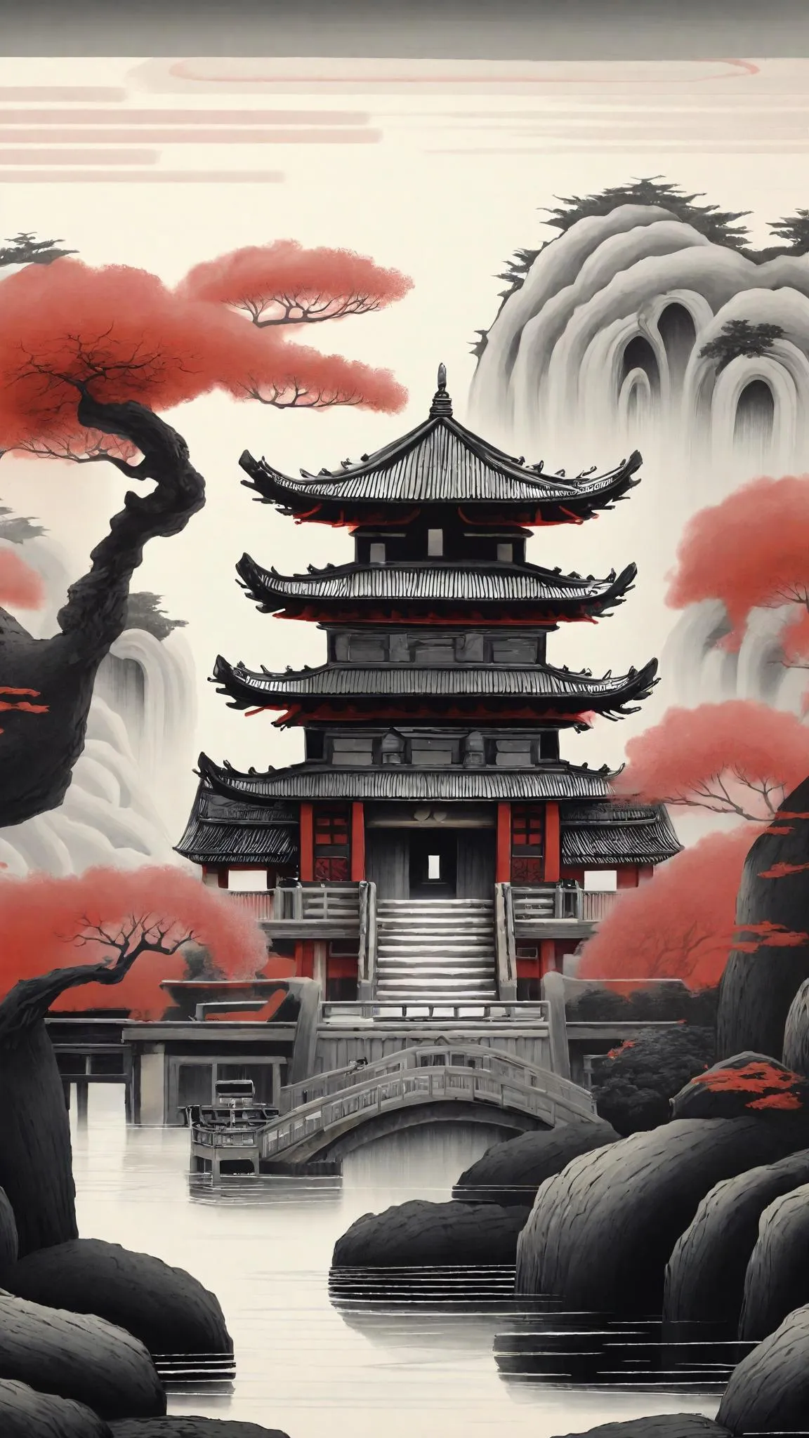 Pastel shallow red, deep black, grays and bright whites Japan ornate old japan depicted in surreal ancient Japanese architecture. Made on scrolls in ancient Japan with essence of a mystical past.